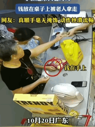 10月20日,广东。小孩在超市买薯片时,将钱放在收银台上等着结账,被一旁结账的老人顺手拿走随后离开,毫无掩饰,动作丝滑流畅。网友:老人估计以为是自己掉的,可急坏了男孩。 我特意看了一下,孩子松手的时候老人眼睛在别的地方,她正在整理钱,老人也老了,会不会她觉得那是她掉的呢?