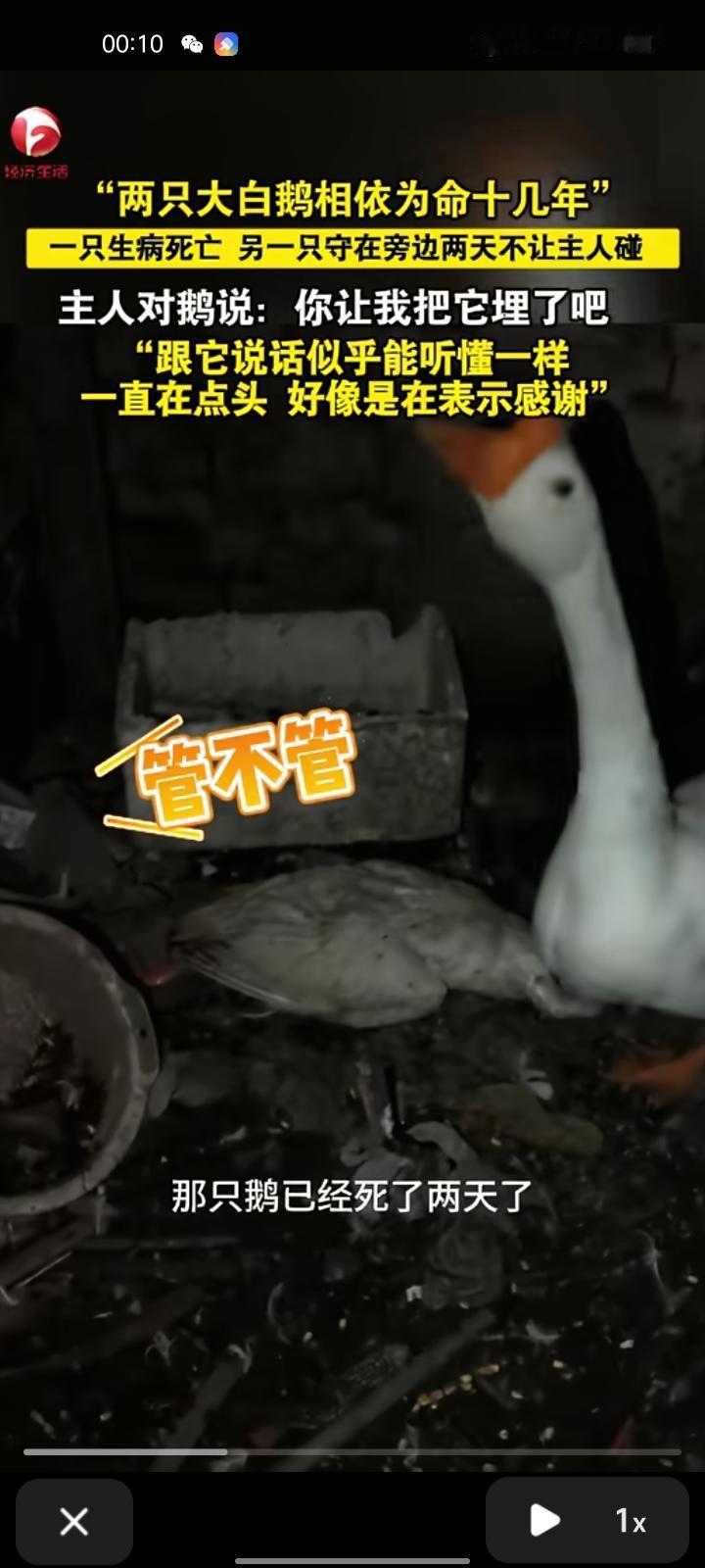 10月19日,商丘市民权县。女子发视频称,两只大白鹅相依为命十几年,一只生病死亡,另一只守在旁边两天不让她碰,她对鹅说:“你让我把它埋了吧”,鹅好像听懂自己在说什么,一直往下低头表示感谢。