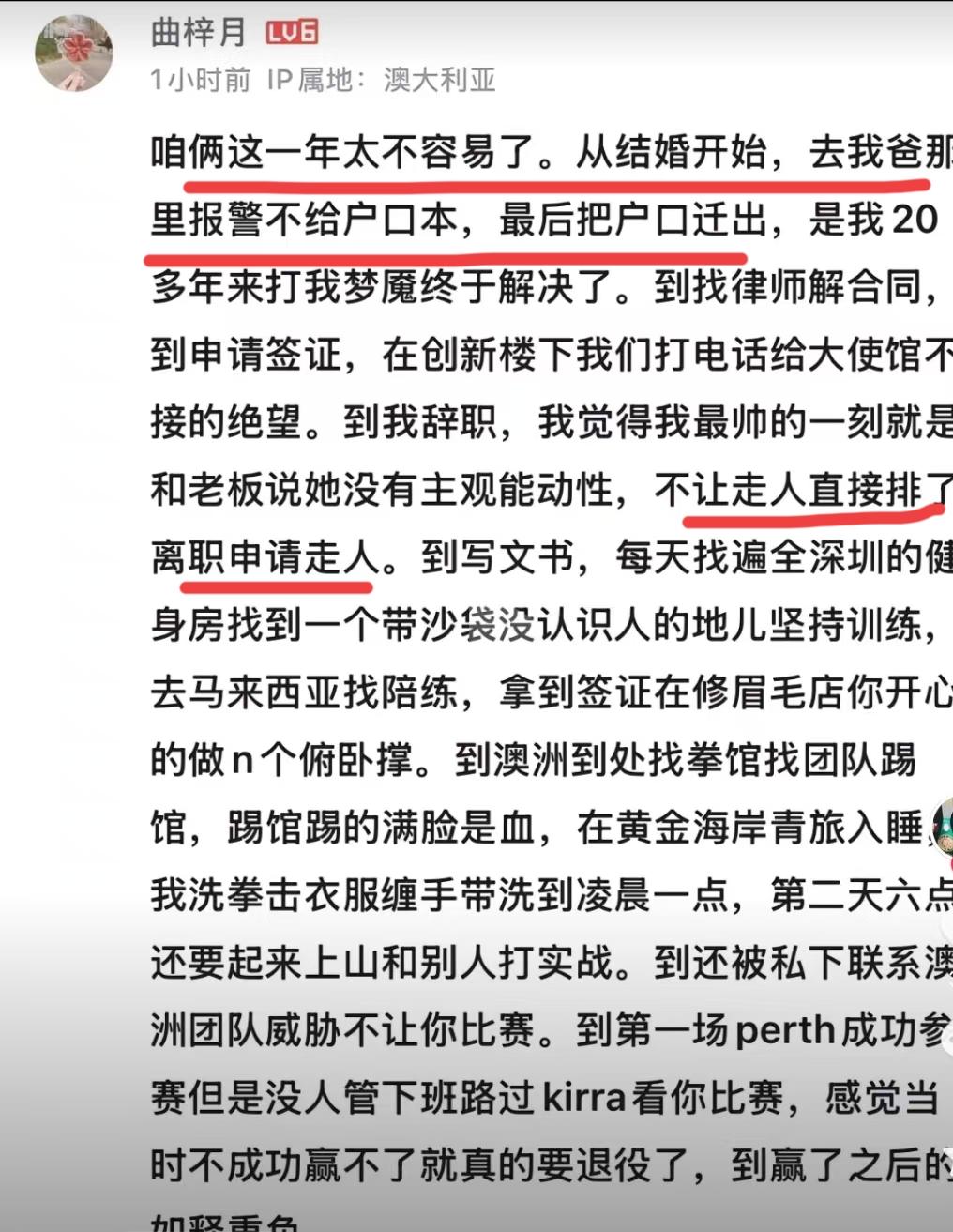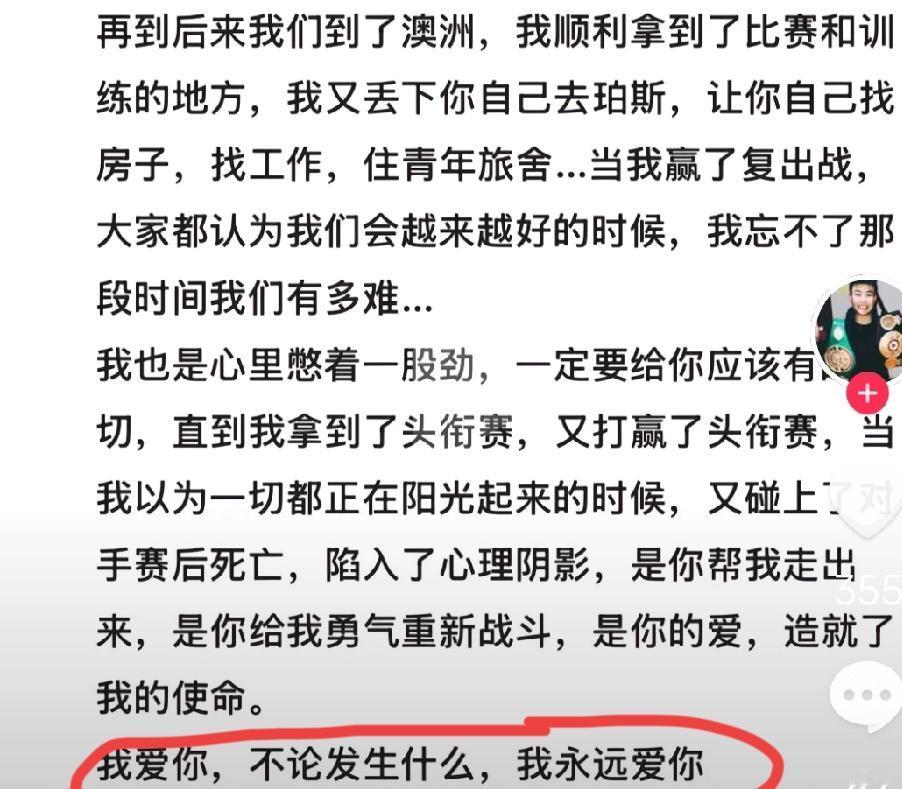 首位00后洲际拳王周润琪称要回国离婚,只因在澳洲遇袭事件中没能保护好妻子。 在他的新帖中,先声明他BOXREC(职业拳击的记录数据库)上国籍是澳洲拳协改的,事实上他国籍并没有改变。 跟原经纪公司打了约一年合同纠纷官司,出走澳洲,公交车上遇袭击,现在决定回国离婚。 周润琪近两年遭遇也是跌宕起伏,这位24岁年轻选手,似乎正处于人生的“待破冰”阶段。 是受挫感让他要离开抛去一切跟他来异国他乡打拼的妻子吗? 今年7月份周润琪晒出与原公司的二审判决书,维持原判,解除劳动合同,驳回公司要30万违约金的请求。 妻子小曲不光帮他打官司,还负责在他在国外的一切事务,包括在澳洲到处找拳馆找团队找房子,自己在青旅装家具。 一次比赛,周润琪的对手赛后离世,也是老婆帮他走出心理阴影,他在自己帖子里写到: “我爱你,不论发生什么,我永远爱你”。 娘家人似乎不同意他俩的婚事,小曲宁可与家人翻脸也要嫁给周润琪。 离家、辞去工作、陪他打拼,然后,因为一次公交车事件,就要离婚,这操作怎么就有点看不懂呢?!