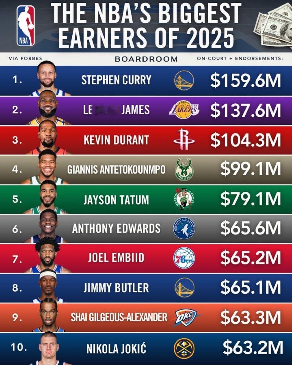 库里是今年 NBA 收入最高的球员🔥 詹姆斯第二 杜兰特第三
