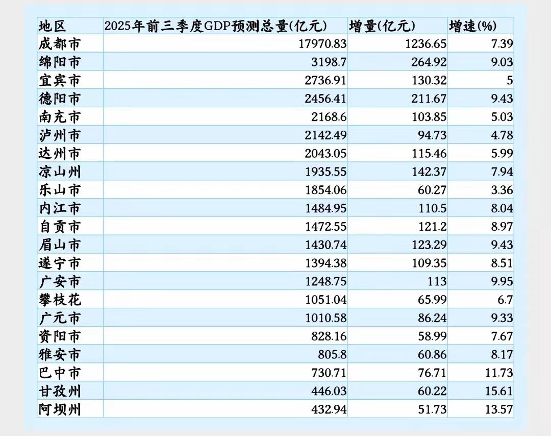 为啥大家都三季度的经济数据预测这么详细,如果能够实现预测的准确性,那么巴中今年实现突破1000亿有点难度了,而南泸达三市的数据差距越来越低,按照增量来说,宜宾、泸州、乐山等几个地市放缓偏低是因为什么原因呢?而绵阳、德阳、凉山州增量持续领先,可见实力不容小觑。资雅巴甘阿5市州稳定发挥持续吊车尾,发展潜力和前景都很不如人意。