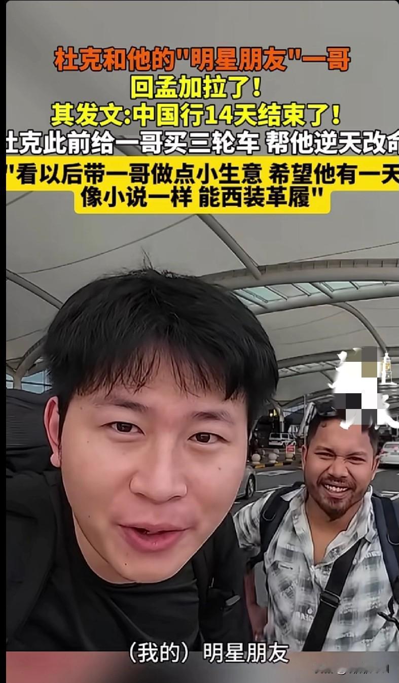 “家人们!这波跨国友情我先磕为敬!杜克带他的孟加拉‘明星朋友’一哥回孟加拉了,14天中国行圆满结束~ 之前杜克给一哥买三轮车帮他逆天改命,现在还打算带一哥做点小生意,盼着他有天能像小说男主一样西装革履!咱就说这现实版逆袭剧本谁不爱看?你们觉得一哥能实现‘西装革履’的梦想不?快蹲个后续,这友情也太暖了!”