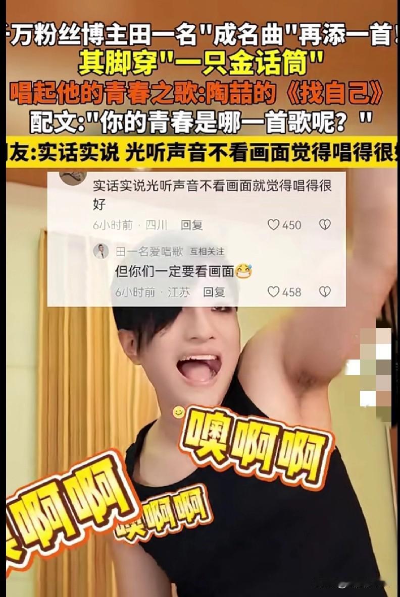 “家人们快来看这波操作绝绝子!万粉博主田一名又整活了,脚蹬‘金话筒’鞋翻唱陶喆《找自己》,还喊话‘你的青春是哪一首歌呢?’ 有网友说‘光听声音不看画面觉得唱得很好’,他反手回复‘但你们一定要看画面’,这反差感也太上头了! 咱就说,这金话筒鞋配青春老歌,简直是把回忆杀和搞笑梗焊死了。你们青春里的本命单曲是哪首?快甩出来,看看谁的青春歌单能撞款!”