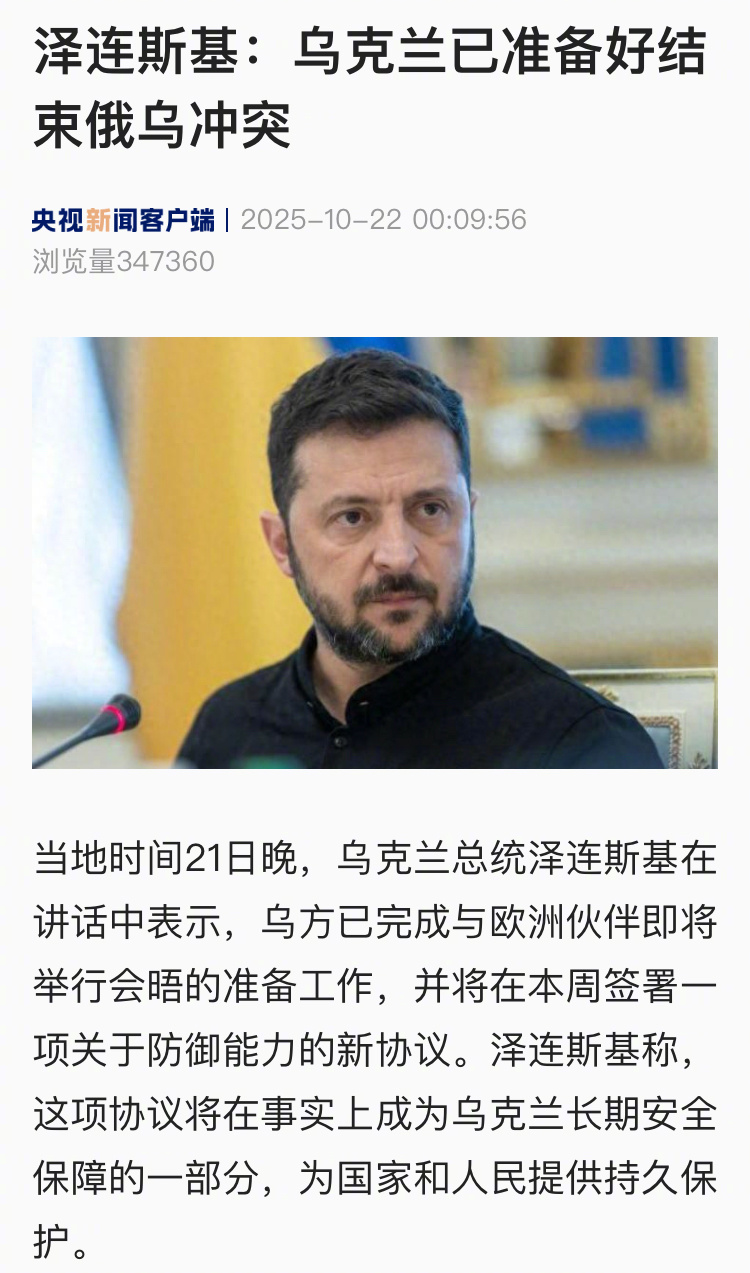 【泽连斯基:乌克兰已准备好结束俄乌冲突】当地时间21日晚,乌克兰总统泽连斯基在讲话中表示,乌方已完成与欧洲伙伴即将举行会晤的准备工作,并将在本周签署一项关于防御能力的新协议。泽连斯基称,这项协议将在事实上成为乌克兰长期安全保障的一部分,为国家和人民提供持久保护。