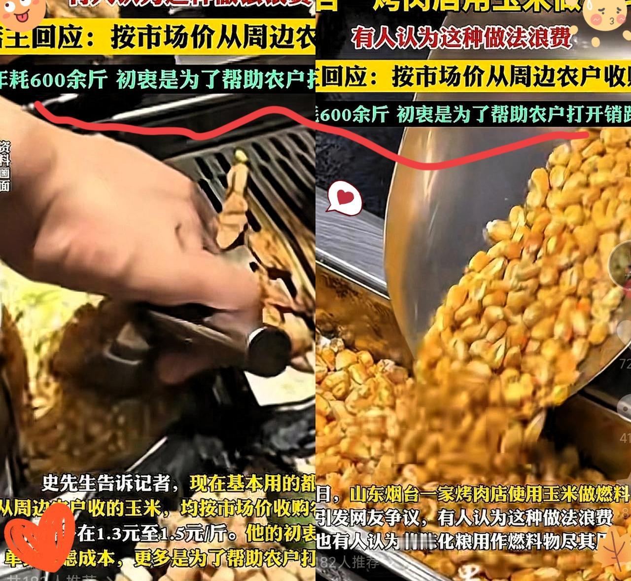 烟台这烤肉店太冤了! 用玉米当燃料被喷浪费粮食, 结果店主一回应, 好多人都沉默了——这玉米是按市场价从周边农户手里收的,年耗才600多斤,初衷就是帮农户打开销路啊! 别光盯着“玉米当燃料”就喊浪费,得看看实际情况。 现在不少农户的粮食卖不出去,有的几毛钱一斤都没人要,放着最后只能坏在家里。 店主收这些玉米,农户能拿到钱,烤肉用着还没致癌物更健康,这哪是浪费,明明是双赢。 从2019年就用陈化粮当燃料,后来还是农户主动找上门要卖,这事儿里根本没“糟蹋粮食”的影子,反倒是帮农户解决了难题。 判断是不是浪费,不能只看东西用在哪,得看它有没有真正帮到需要的人。 你们觉得这种帮农户销粮的方式靠谱吗? 要是身边有卖不掉的农产品,还能想到啥好办法?