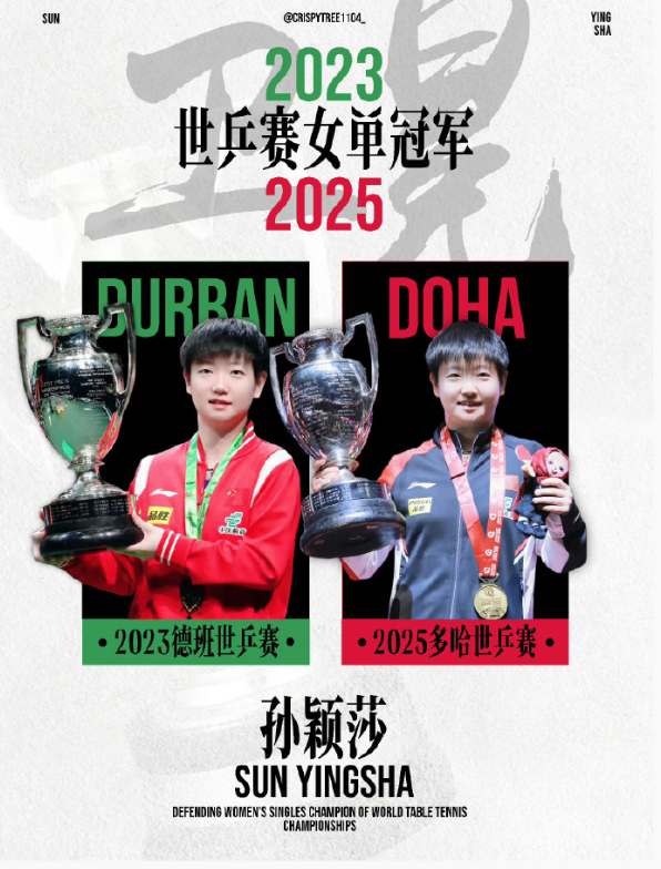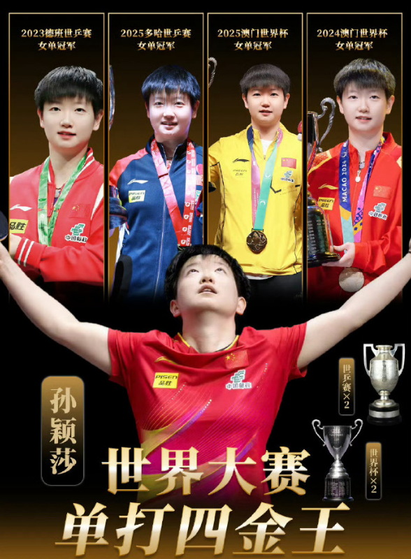 24岁的孙颖莎已获102个冠军,其中17个是世界冠军,今年10次单打比赛,9次进