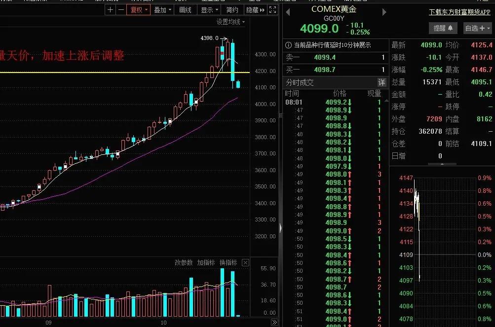 黄金最近持续加速上涨,周线9连阳,上周单周暴涨6.69%,周五分歧大跌,周一反包新高,周二暴跌。