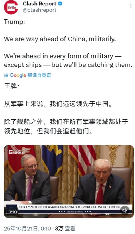 10月21日,特朗普表示:“从军事上来说,我们远远领先于中国。除了舰船之外,我们在所有军事领域都处于领先地位,但我们会追赶他们。” 特朗普又开始左右脑互搏了?一会“领先”,一会“追赶”的。先不说别的,单说“除了舰船之外”这半句,就藏着不少没法细扒的实情。2025年的数据摆着呢,中国海军的舰艇总数都快摸到395艘了,美国这边才296艘,这差距可不是随口一句“追赶”就能抹平的。 更关键的是造船速度,中国船厂跟流水线似的下水新舰,美国智库都算过,这产能差不多是美国的200倍,真要追起来,怕是没那么容易。 要是往前倒腾几天,还能发现更有意思的事儿。10月中旬特朗普还在海军基地吹,说美国核潜艇技术领先中国25年,结果没几天美媒就带头拆台,《Mint》杂志直接在头版写着中国海军是“史诗级超越”。那会儿他还说中国五年内可能追平潜艇技术,这会儿又把所有领域的领先权都揽过来,这嘴皮子翻得比翻书还快。 再说所谓的“所有军事领域领先”,也经不起较真。空军方面,中国的歼-20隐形战机早就批量服役了,数量稳步往上走,隐身性能和超视距作战能力一点不虚,怎么看也算不上被“远远领先”。 火箭军更不用提,东风-17高超音速导弹都服役好几年了,飞得快还能变轨,现有的防空系统根本拦不住,美国到现在也没拿出能对等的装备。就连核力量,中国的核武库也悄悄扩到了600枚左右,陆海基都有投放方式,形成了实实在在的威慑力。 美国军力这些年其实一直在掉链子,海外行动耗了不少元气。伊拉克打了那么多年花了上万亿美元,最后留下个烂摊子;阿富汗撤军时丢了大把装备,国际上都看在眼里。现在征兵都成了难题,装备维护成本高得吓人,军费虽然快到万亿美元,可效率低得离谱,钱花出去没见着多少实在提升。 就说航母,美国是有11艘,可中国福建舰都完成海试了,航母编队的作战能力一步步赶上来,再配上东风系列导弹,这些航母能不能安心在西太平洋晃悠,美国自己心里恐怕也打鼓。 特朗普这套话术其实不新鲜,跟他之前谈关税时的路子如出一辙。嘴上喊得凶,实际心里门儿清。 10月17号他还在采访里说“是中国逼我的”,转头就换了套说辞,本质上都是想制造点声势。毕竟国内经济压力不小,找点外部话题转移注意力是老套路了。而且他也得给军方和选民画个饼,一边说领先能稳住人心,一边说追赶又能伸手要军费,算盘打得噼里啪啦响。 可数据不会骗人,中国国防预算2025年约2350亿美元,全砸在高科技领域,人工智能、无人作战系统都往军事上用,联合作战能力也通过和巴基斯坦的演习亮过相。反观美国,盟友体系都开始松动,菲律宾这些国家跟美国走近归走近,真要动真格的谁也不愿当炮灰。这么看下来,特朗普的话更像场政治秀,一会儿抬自己,一会儿找台阶,就是没多少真东西。 要是真较真“追赶”这事儿,美国怕是得先解决自己的问题:造船速度提不上来,装备迭代慢,海外消耗止不住,光靠嘴说可追不上。毕竟中国这些年的进步都是实打实干出来的,不是靠口号喊出来的。