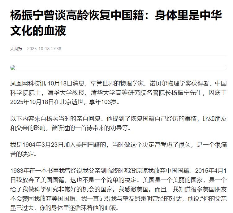 杨振宁将清华薪资,诺贝尔奖金捐献出来,看到金额,才知道多伟大。 杨振宁的名字常常与诺贝尔奖挂钩,代表着物理学界的顶峰,清华园对于他而言,不仅仅是一个工作地点,更是深深根植于他生命中的家园。 7岁时,他便在清华园度过了童年,父亲杨武之在清华大学的任教,他在这里生长学习,早就把这里当成了家。 2015年他决定放弃美国国籍,恢复中国身份,进一步印证了他对祖国深深的归属感和责任感。 同时,杨振宁的行动证明了他回国并不是为了享受晚年,而是一场“回报社会”的实际行动。 他当时得到清华提供的百万年薪和别墅,但他却决定将这份薪水全部捐出,这一捐款持续了十几年,累计金额已超过两千万,彻底打破了那些认为他回国是为了安度晚年的质疑。 这样的捐赠不仅仅是资金上的支持,更是他全心投入中国科研事业的实际行动。 回顾他更早前的捐赠行为,1957年他获得的诺贝尔奖金,在当时能够购买多套豪宅,但他选择将这些钱几乎全部用于支持中国的科教事业,帮助更多的中国学者出国深造。 他在上世纪80年代就通过纽约成立委员会,发起筹款,资助了80多位学者的留学梦想,其中一些后来成为中国顶尖高校的校长。 杨振宁的捐赠远远不止现金,他在美国的那套房产也捐给了清华,成为科研经费的一部分,而当他获得“求是终身成就奖”时,他将这笔奖金也毫不犹豫地捐出,专门用于支持青年学者。 有人估算,他通过捐赠和筹款等方式,贡献的资金总额已经超过一亿五千万,他曾说过一句话,“钱对我没啥用,给教育科研才值。” 杨振宁的贡献不仅仅体现在金钱上,他深知,光有钱还不够,培养人才需要一个完整的系统。 因此,他亲自参与、推动了多个教育科研项目,1996年,清华大学决定模仿普林斯顿模式建立高等研究中心,杨振宁二话不说便答应了,并亲自担任名誉主任。 为了筹集启动资金,他甚至在高龄时亲自奔走,四处筹款,确保资金到位,他更是亲自负责项目的实施,邀请了包括图灵奖得主姚期智和数学家林家翘等世界顶尖学者来清华任教,推动了整个学术环境的提升。 他对人才的培养也体现在细节上,2009年,他发起了清华“学堂物理班”,为最有潜力的学生提供最优质的教育资源,包括世界一流的设备和国际交流机会。 他不仅为学术界带来了先进的资源,更亲自站上讲台,为大一新生讲授物理课程,82岁时,他仍然坚持每周两次、全程站着讲课,热情投入,始终保持着高度的敬业精神。 他的贡献远不止金钱的支持,更在于他一生的学术精神与对人才培养的深入参与,他的这种精神,激励着一代又一代学者,不仅提升了中国的科研水平,也改变了中国人“总是落后于人”的心态。 杨振宁用一生的行动证明了,真正的“回归”不仅仅是回到一个地方,更是回归到心中的责任和使命。 信源:大河报