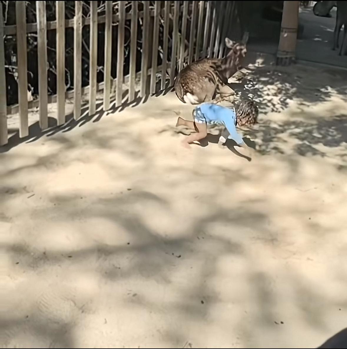 去年好歹有衣服穿,应该是今年就不给衣服他穿了!孩子旁边有只鹿,每次的场景都有动物
