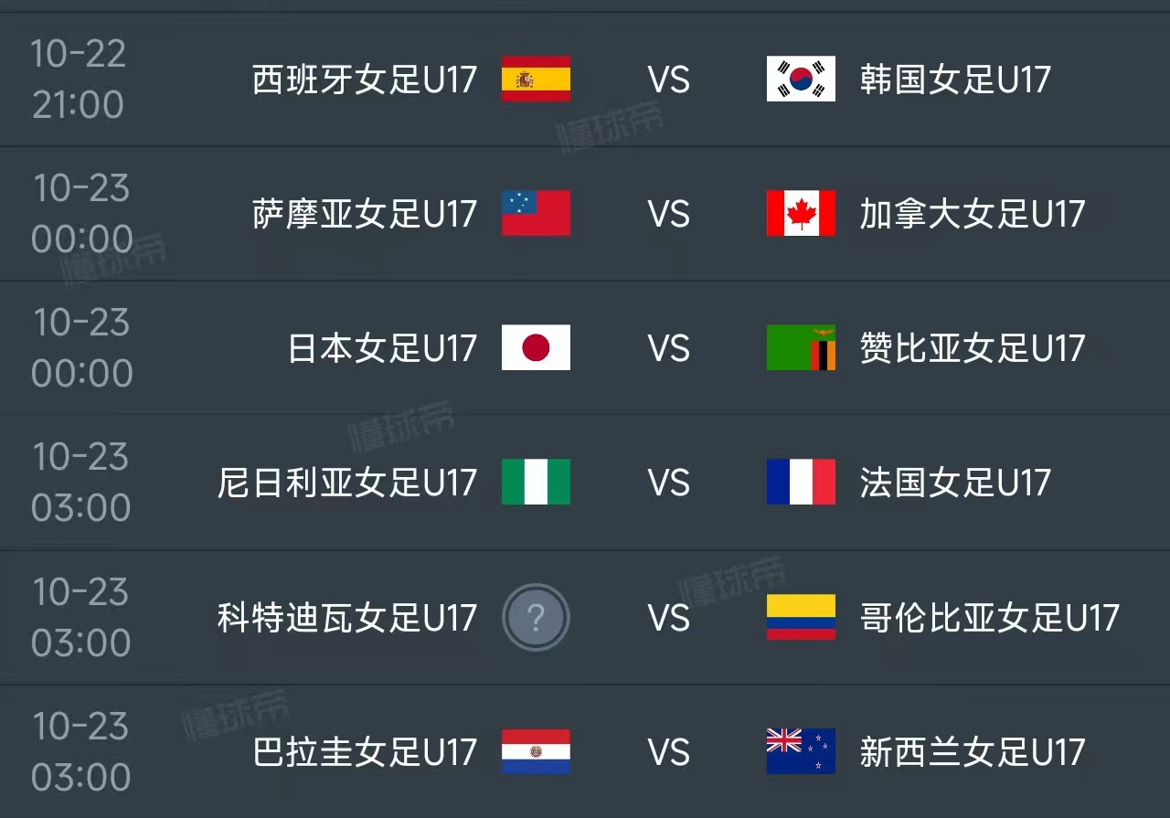 北京时间10月22日-23日,U17女足世界杯小组赛第二轮6场赛程如下: 22
