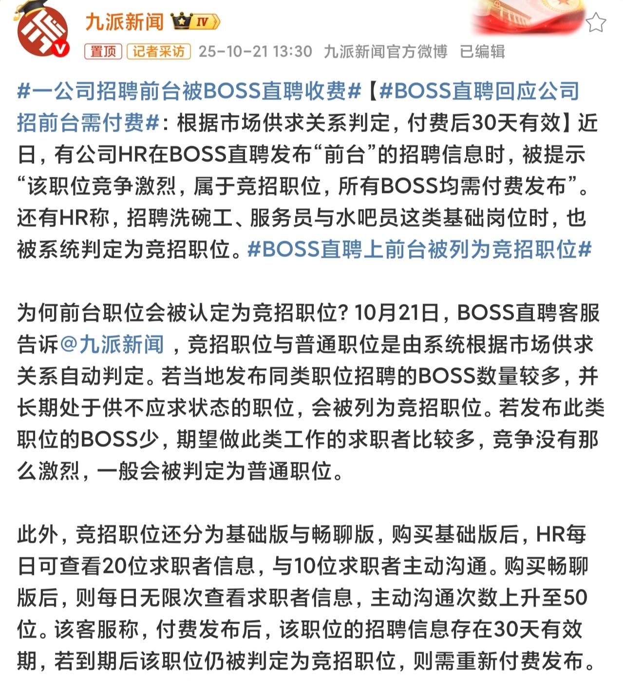 一公司招聘前台被BOSS直聘收费这不是很正常的嘛,这个平台不向求职者收费,就只能向招聘者收费,难道指望有客户在上面打广告创收。至于向招聘者收费,他肯定还是要分级的,你开个影视会员还分月季年,买个车分标准pro max呢,不想付费发布那不是白嫖吗?