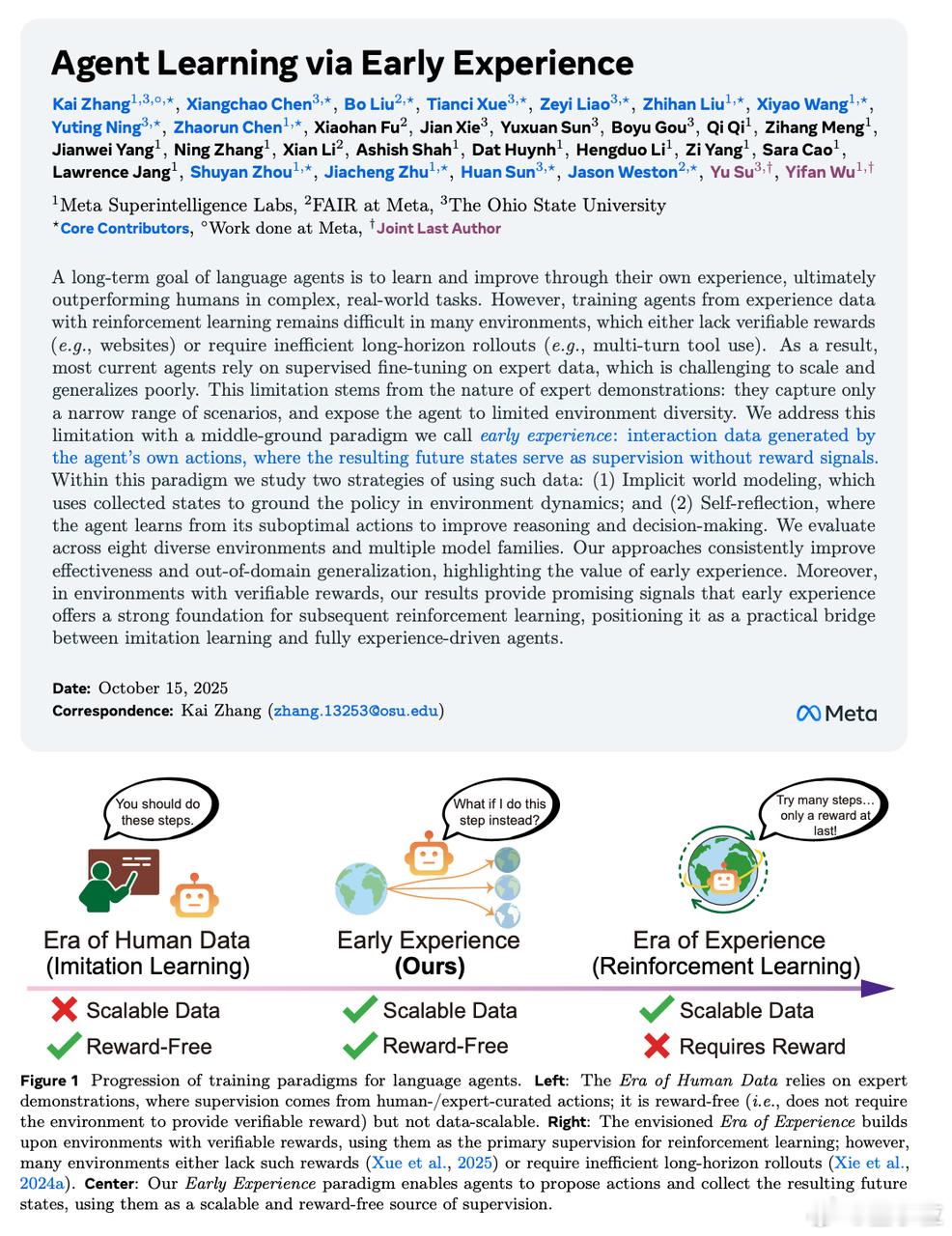 现在,Meta联合俄亥俄州立大学提出了一个新方法:Early Experience。它不需要奖励、不靠人类专家,而是让AI自己探索,然后从自己做出的“动作→结果”中学习。