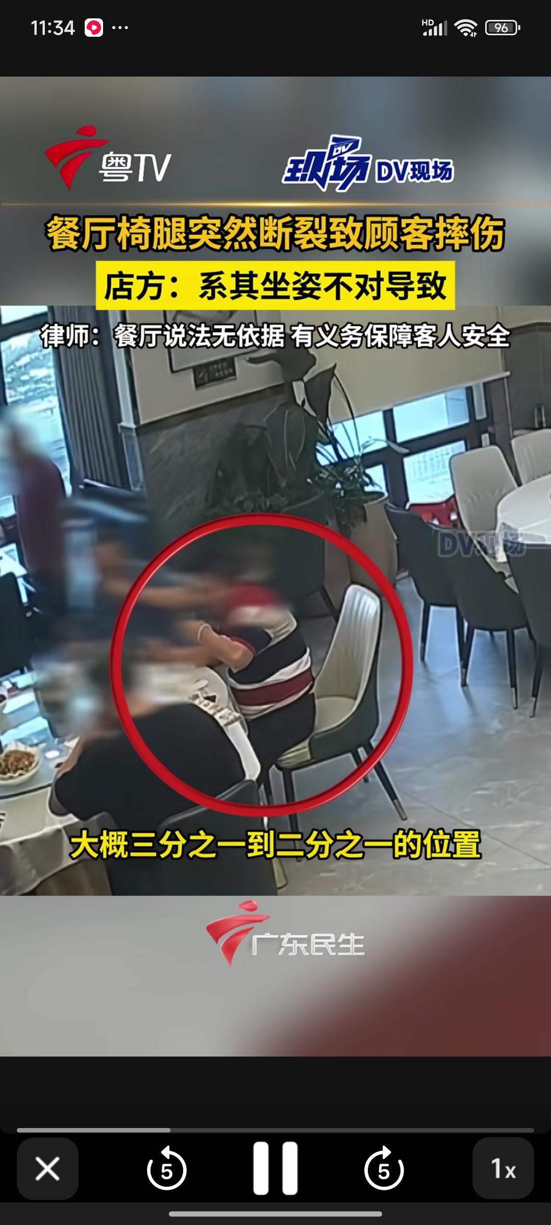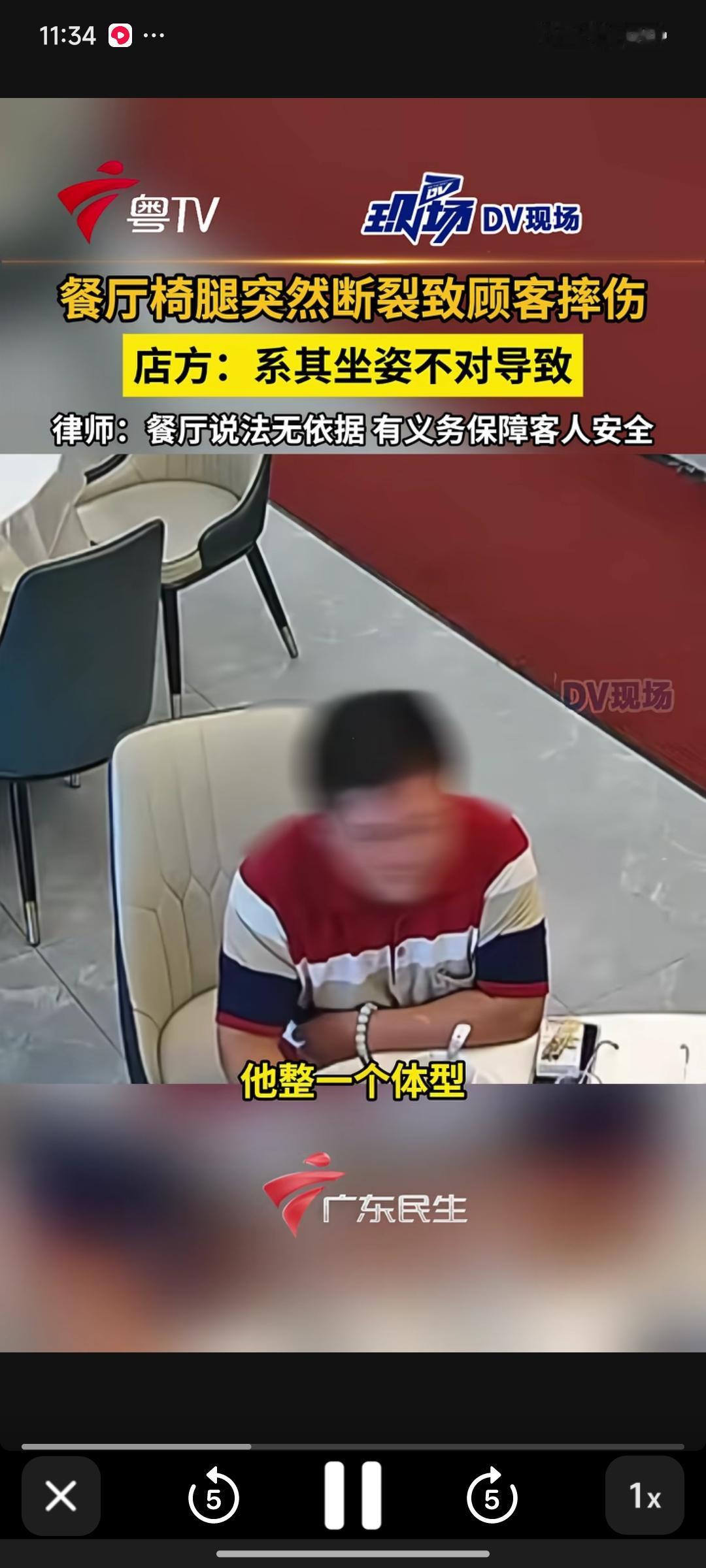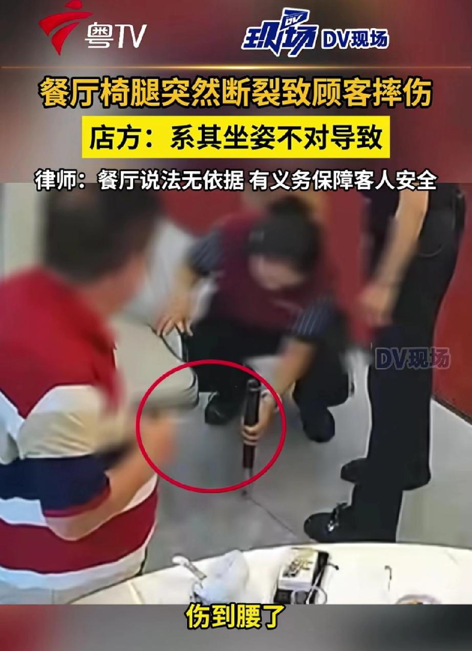 广东东莞,一名男子在餐厅用餐时,座椅腿突然断裂,整个人摔到地上,致使尾椎骨断裂,