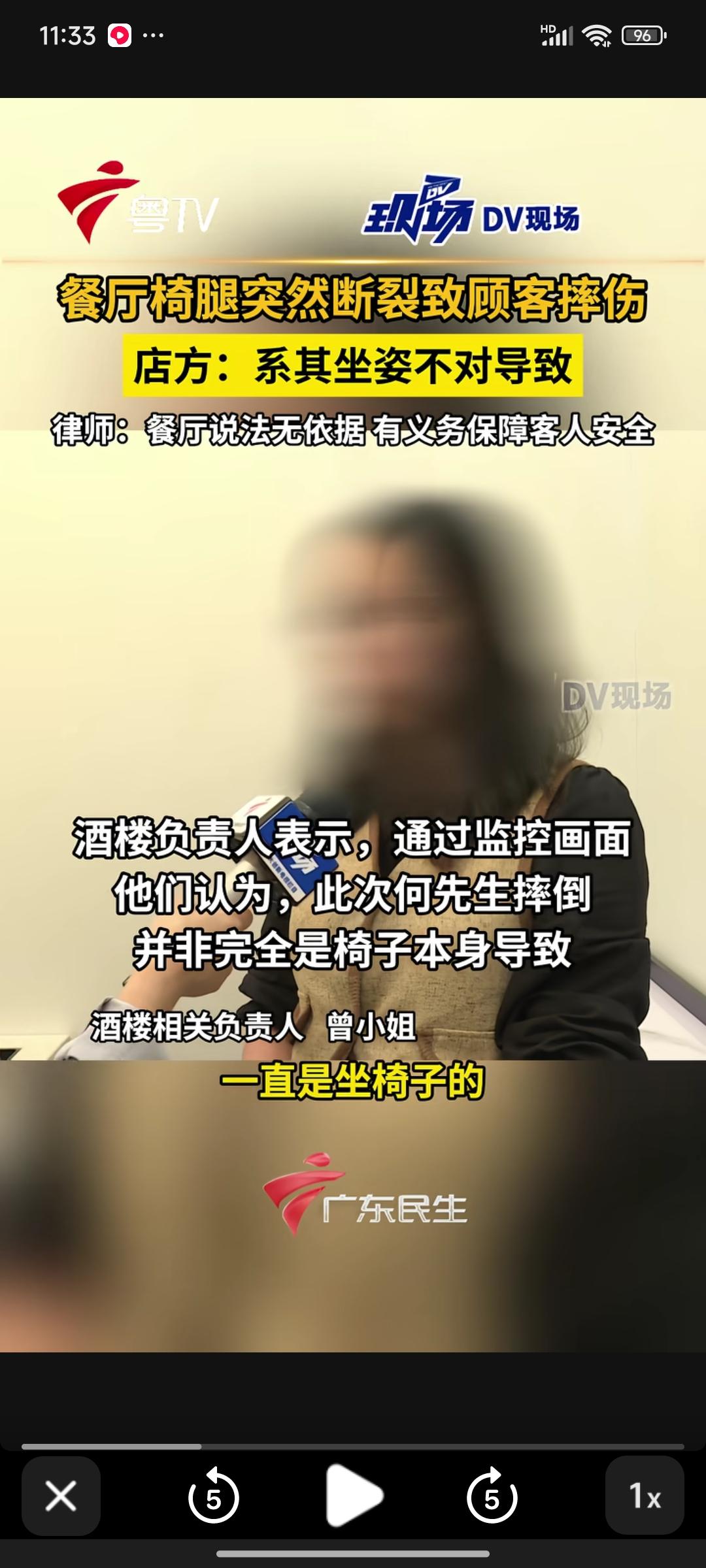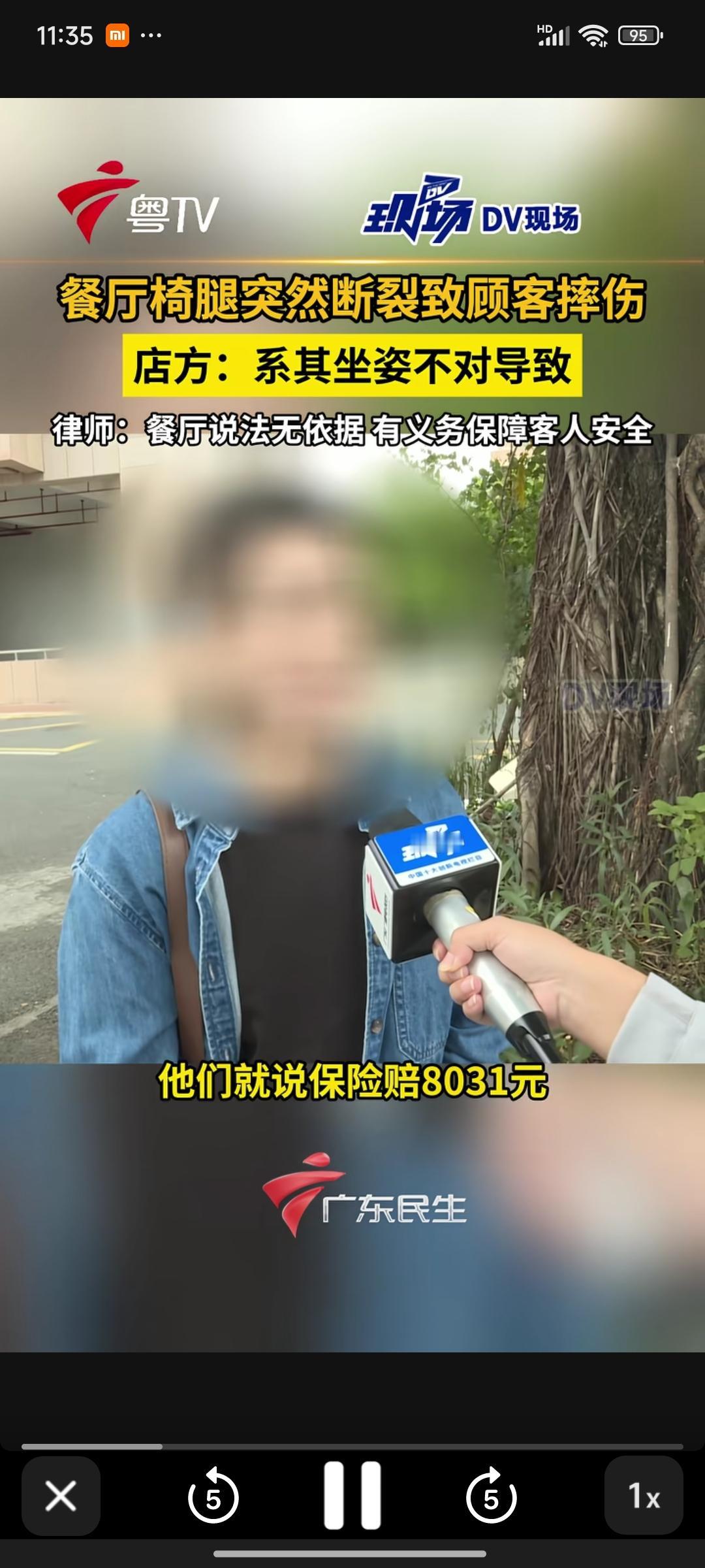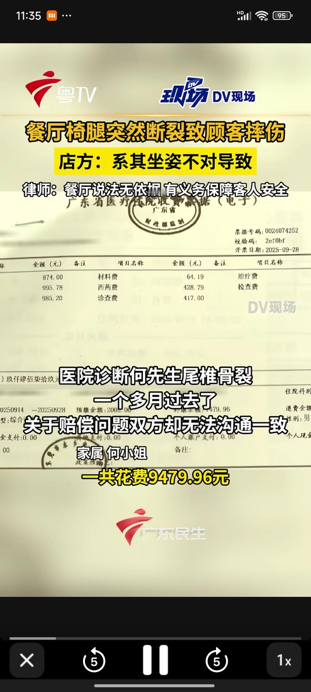 广东东莞,一名男子在餐厅用餐时,座椅腿突然断裂,整个人摔到地上,致使尾椎骨断裂,