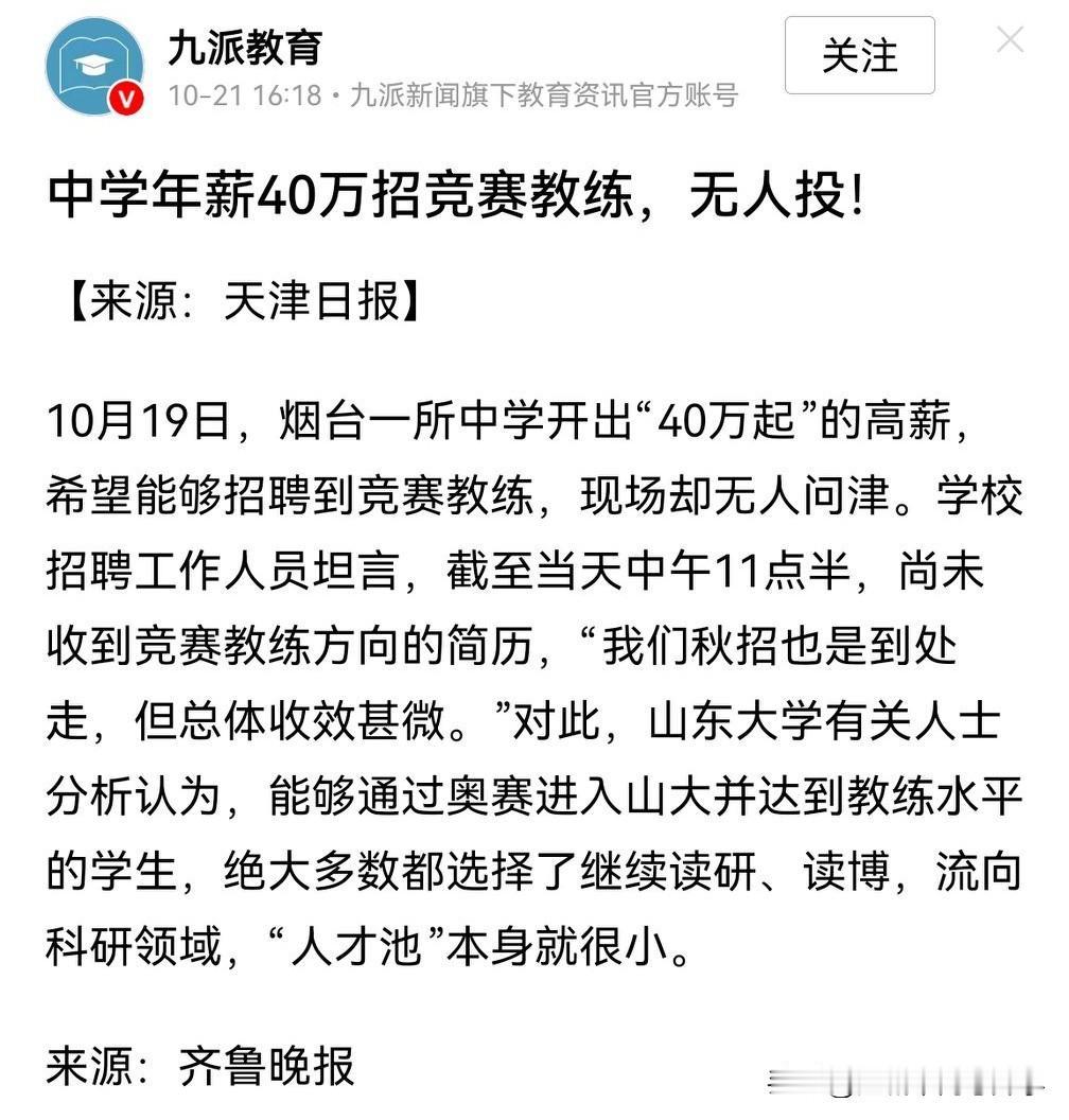 烟台一中学招聘竞赛教练40万年薪无人问津 如今竞赛教练属于高薪职业, 而且各省