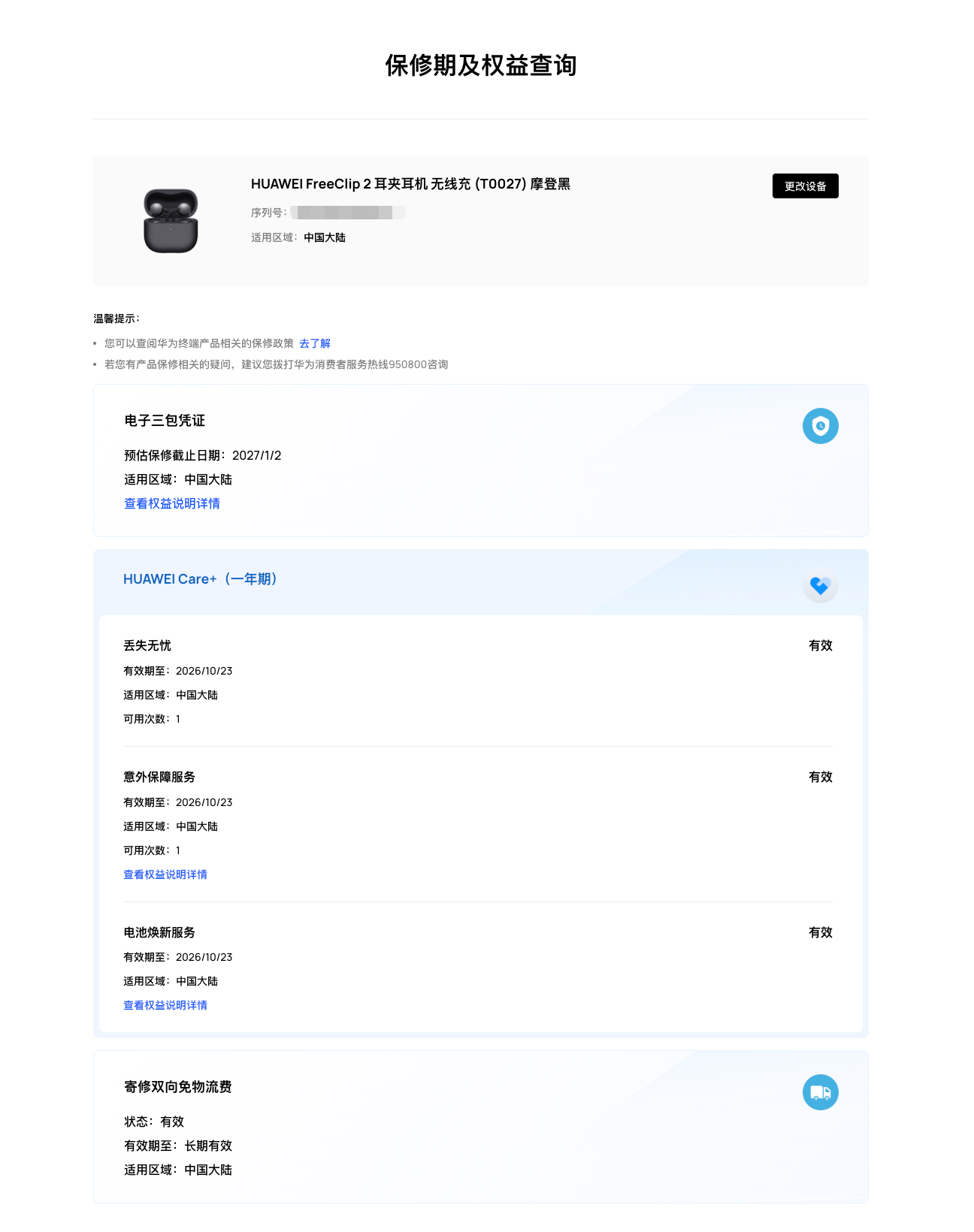 嚯,现在到11月13日期间激活的华为FreeClip 2都可以领取HUAWEI Care+(一年期),包含1次意外保障、1次丢失无忧、1年电池焕新[憧憬]价值99元,基本上一年内你就可以浪了,丢一只耳机的话可以半价买新的,损坏的话掏68元服务费就可以修了。 ​​​