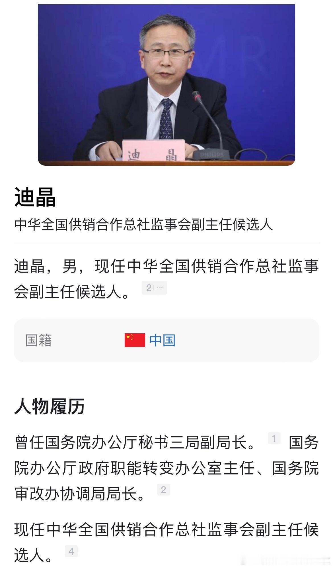 中华全国供销合作总社官网“领导班子”一栏显示,迪晶已任中华全国供销合作总社监事会副主任人选。热点现场