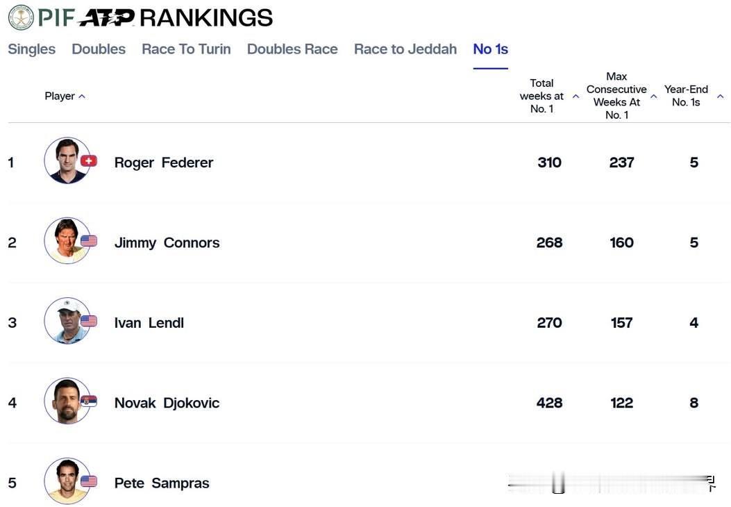 男子网坛这些纪录永远无人能破: 纪录一:德约科维奇,8次年终世界第一。众所周知,这可谓是相当惊人的长寿。 纪录二:费德勒,连续237周位居世界第一。连续4.54年保持世界第一,简直令人难以置信。别跟我说什么“弱年”之类的话,这依然很了不起。 纪录三:康纳斯,总共赢得109个冠军。德约科维奇可以追赶这个纪录,但必须在250级别的比赛。我不确定他能否在500赛夺冠,更别提大师赛以上了。