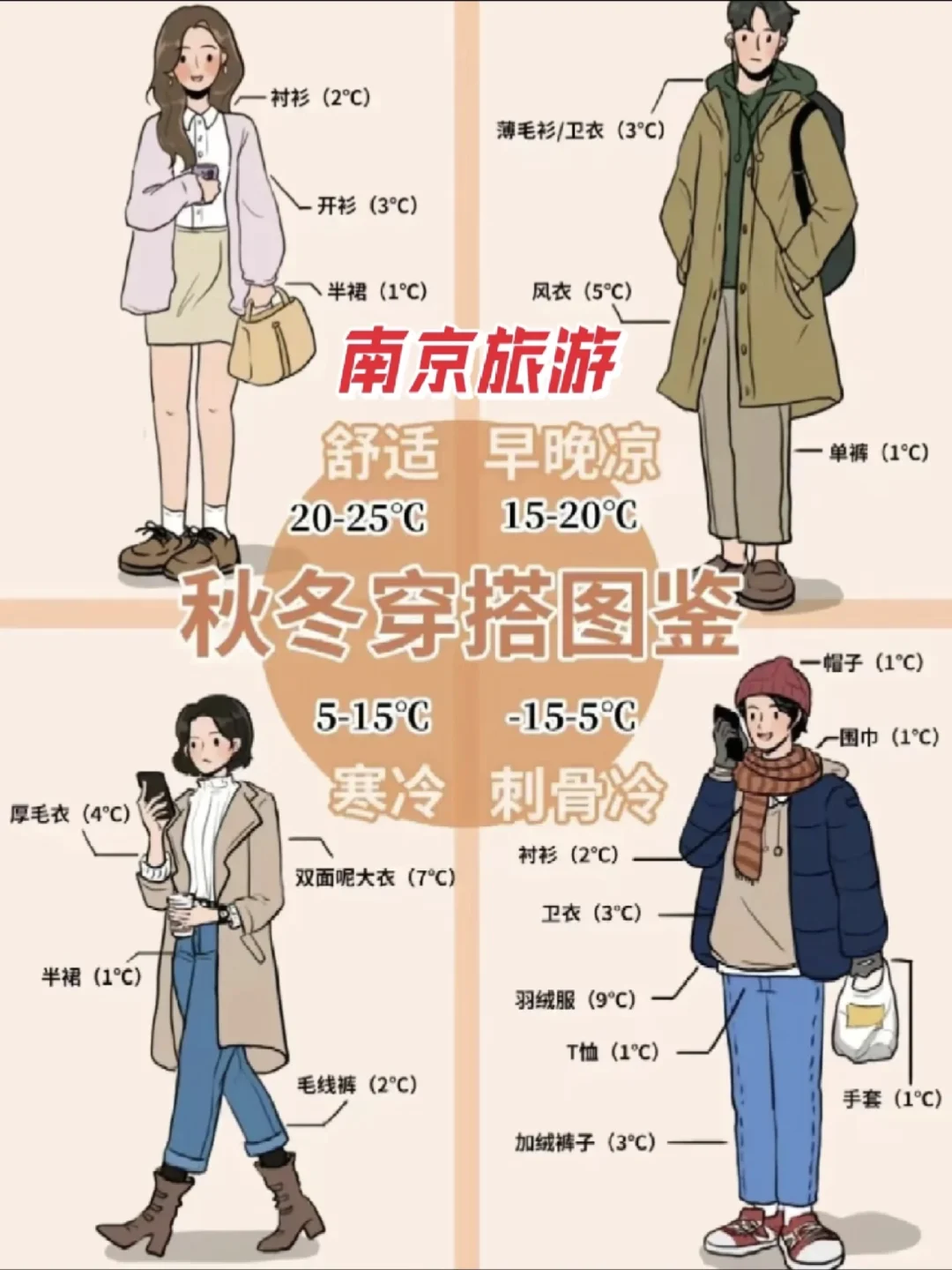 南京秋冬天气多变,一天一个样。建议出发之前多看近期南京天气预报,按26°穿衣法则准备衣物,基本不会出错~