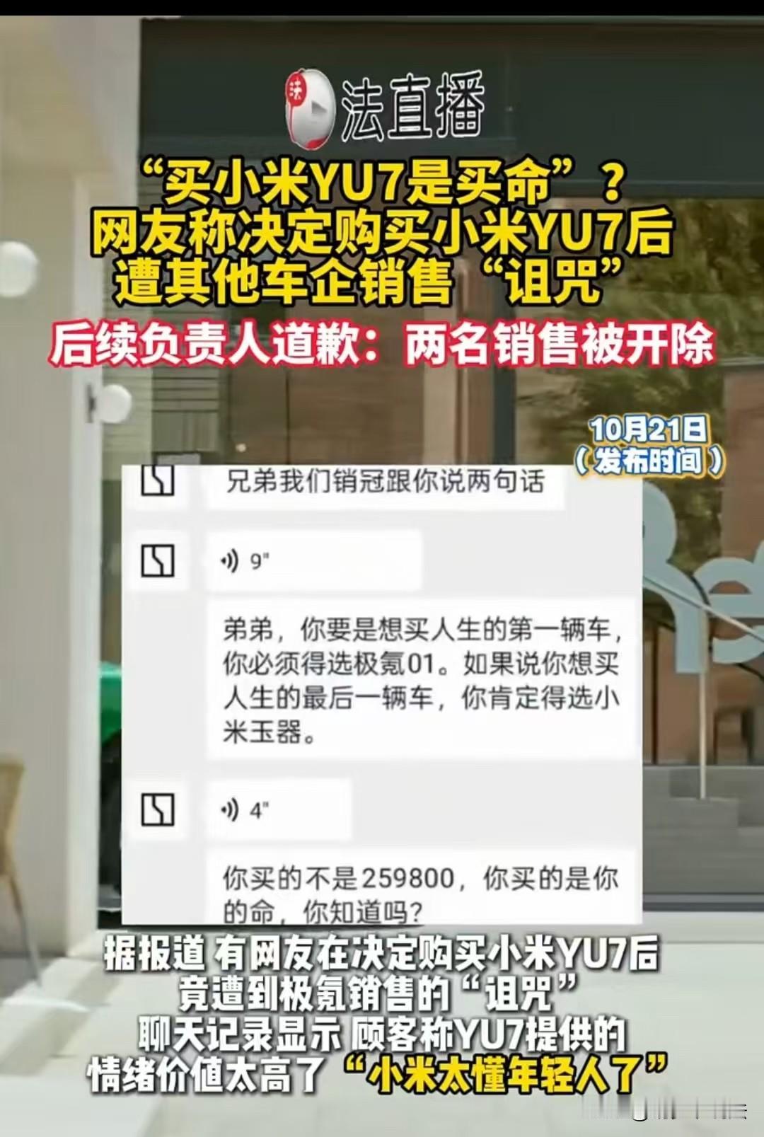 南京,22岁顾客对比极某牌与小某牌汽车后选小某某7,竟遭极某销售人员言语“诅咒”,称“买小某某7是人生最后一辆车,花的是命”。顾客发帖讨说法引发热议,极某连夜致歉并重罚:涉事销售被开除且永久不录用,门店及区域管理层也因失职受罚。 2025年10月,南京一名22岁的年轻顾客打算入手人生第一辆新车,第一站便走进了浦珠北路的极某门店。 他一眼看中了极某001,试驾时对车辆的操控和空间表现也颇为认可,但本着货比三家的想法,并没有当场下定决心,只是说想再四处转一转。 门店的两名销售人员于某某和侯某某见状,赶紧热情地凑上来,一边递名片一边说着车辆的各种优惠政策,顺势加了顾客的联系方式,反复叮嘱有任何问题都能随时找他们,眼神里满是怕单子跑掉的急切。 看着顾客转身离开的背影,两人又远远望见他径直走进了隔壁的小某汽车门店,心里顿时咯噔一下,既不甘又焦灼,只能隔着玻璃眼巴巴地看着顾客坐上小某某7完成了试驾。 接下来的两天里,于某某和侯某某几乎没停过给顾客发消息,从续航能力到底盘调校,一条条细数极某001的优越性,试图用各种产品亮点打动对方。 但这位顾客十分理智,并没有被密集的信息轰炸左右判断。他坦诚地回复,试驾小某某7后,发现那款车的设计理念更对年轻人的胃口,尤其是智能配置带来的情绪价值,让他觉得小某更懂自己的需求。 眼看顾客态度坚决,两名销售人员急了,祭出了“最后一招”。 其中一人直接发来语音,语气带着明显的不满:你要是想买人生的第一辆车,必须得选极某001,如果你想买人生的最后一辆车,肯定得选小某某7,你买的不是25万9800,你买的是你的命啊。 顾客听完当场愣住了,自己只是基于喜好做选择,怎么就被如此“诅咒”? 一股火气瞬间涌上来,但他没有和销售人员直接争执,而是将聊天记录和语音转文字截图发到了社交平台,语气里满是不解:现在的销售人员都这样吗?不在他家买就诅咒顾客,太过分了。 帖子发出后很快引发热议,有网友怒斥销售吃相难看,也有人质疑极某的管理存在漏洞。 极某汽车苏鲁战区负责人王经理在当晚9点半就紧急联系上顾客,语气恳切地致歉:我们的销售伙伴表述极为不得体,这不是公司和团队的本意,完全违背了品牌行为规范。 随后,极某官方通报了处理结果:涉事销售于某某、侯某某因言语不当造成严重顾客体验问题,依据《零售业务合规管理办法》被扣除12分合规分,判定为三级违规违纪,立即解除劳动合同且不得再被集团任何公司录用。 除了直接责任人,管理层也被连带追责,浦珠北路极某家店长武某某因管理失职扣除3分合规分,南京单元城市经理芮某某因间接管理责任扣除2分合规分,两人均面临绩效扣除和取消升职机会的处罚,王坤本人也公开表示将承担相应管理责任。 这波处理速度让原本只是想发泄情绪的顾客有些意外,甚至多少觉得不好意思,很快便删除了原帖。 网友们对此也议论纷纷,有人说个别销售的极端行为不能代表品牌,但极氪的处理还算及时果断,也有人提醒:车企拼业绩的同时,更得管好销售的嘴,尊重顾客和对手才是长久之道。毕竟,谁也不想在看车时遭遇这样的糟心体验。 《反不正当竞争法》第十二条,经营者不得编造、传播或者指使他人编造、传播虚假信息或者误导性信息,损害其他经营者的商业信誉、商品声誉。 这条法律禁止商家靠说对手坏话抢生意。极某销售说“买小某某牌是人生最后一辆车,花的是命”,就是编造误导性信息,暗示小某车不安全,故意抹黑小某的口碑,以此逼顾客选自己的车,这已经踩了不正当竞争的红线。 《消费者权益保护法》第二十五条 ,经营者不得对消费者进行侮辱、诽谤,不得搜查消费者的身体及其携带的物品,不得侵犯消费者的人身自由。 商家得尊重顾客,不能骂人造谣。极某销售用“买命”这种话,表面是激将,实际是诅咒顾客选小某会出事,这就是对顾客的诽谤,让顾客受了气还被冒犯,完全侵犯了消费者的人格尊严。 对于此事,大家如何看? 素材:红星新闻2025-10-22