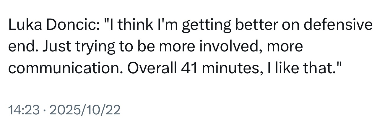 东契奇表示:"我觉得自己在防守端有所进步。就是尝试更积极地参与防守,加强沟通。总体来说上场41分钟,我对这个时长很满意。"