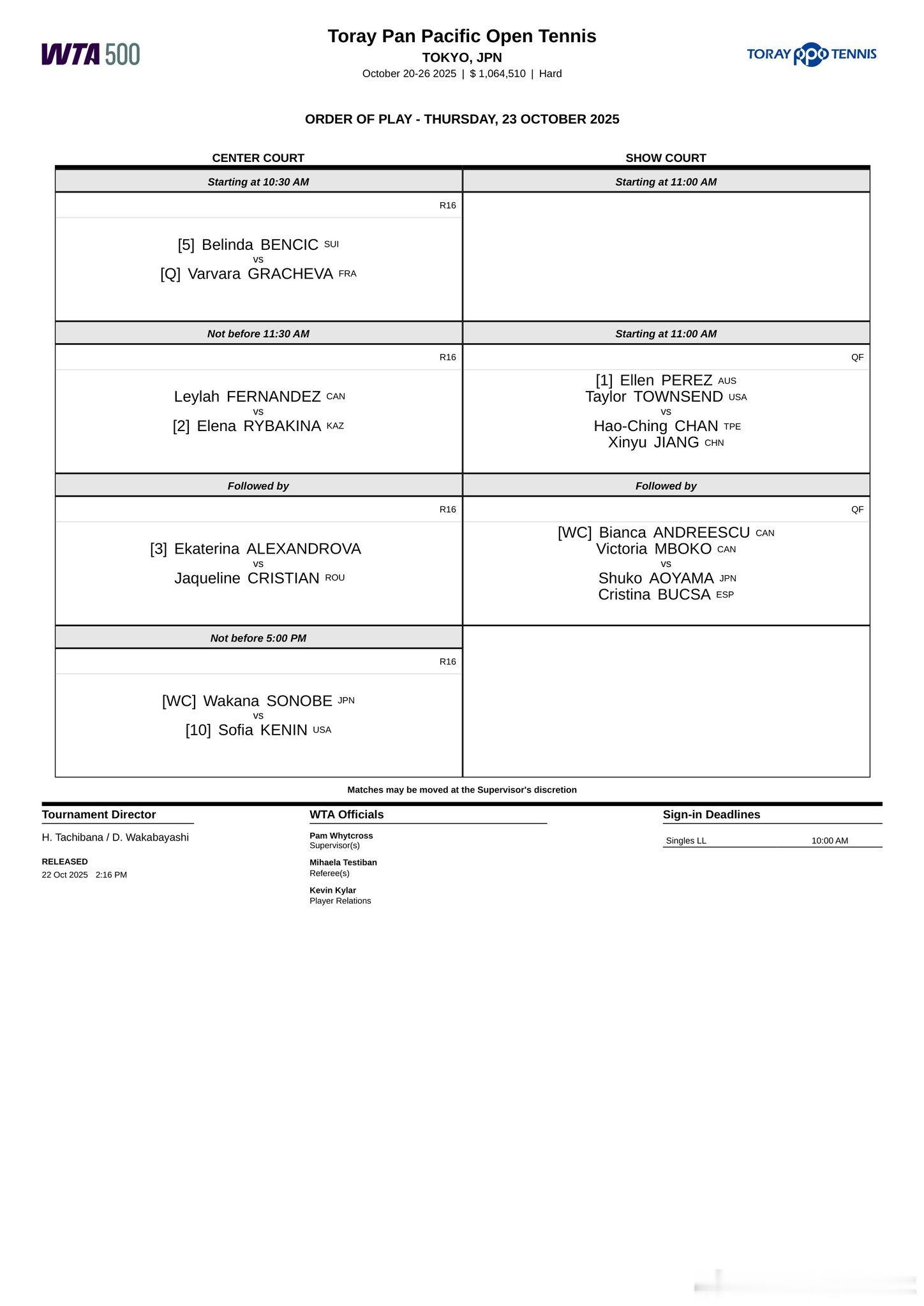 明天东京赛中心场第一场是本西奇vs格拉乔娃,随后是莱巴金娜vs费尔南德斯,不早于明早11:00;