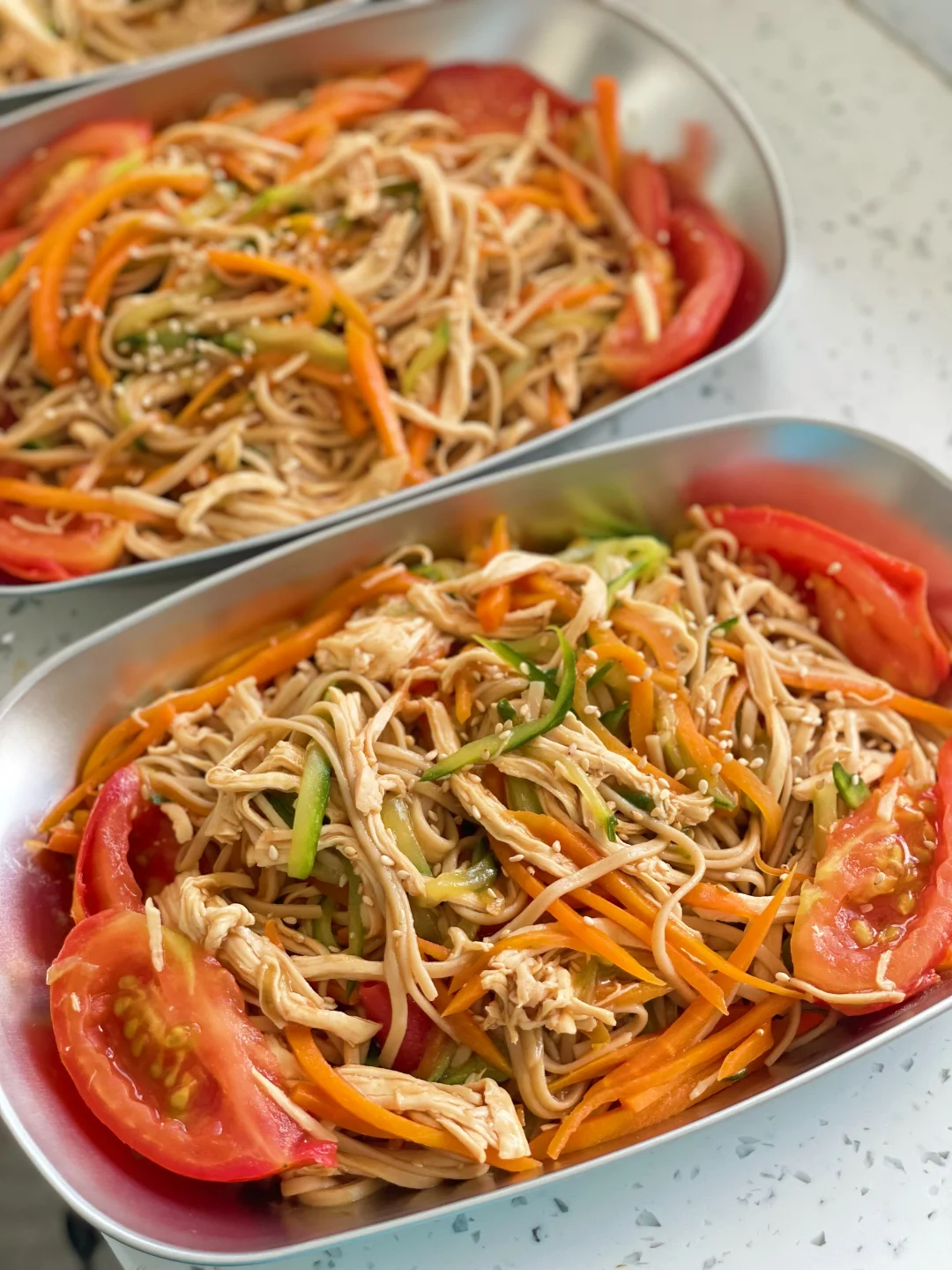 鸡胸肉|姜葱|料酒|胡萝卜|黄瓜|西红柿|荞麦面|蚝油|生抽|白芝麻