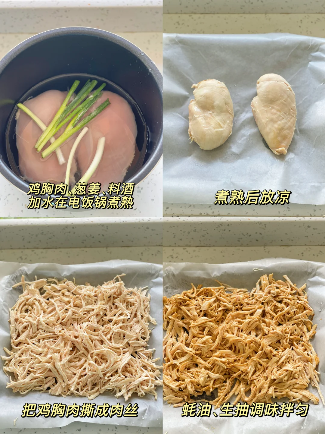 1️⃣鸡胸肉,放入清水中加入葱姜和料酒去腥。鸡胸肉煮熟,煮熟的鸡胸肉放凉手撕成鸡丝拌一点生抽、蚝油备用
