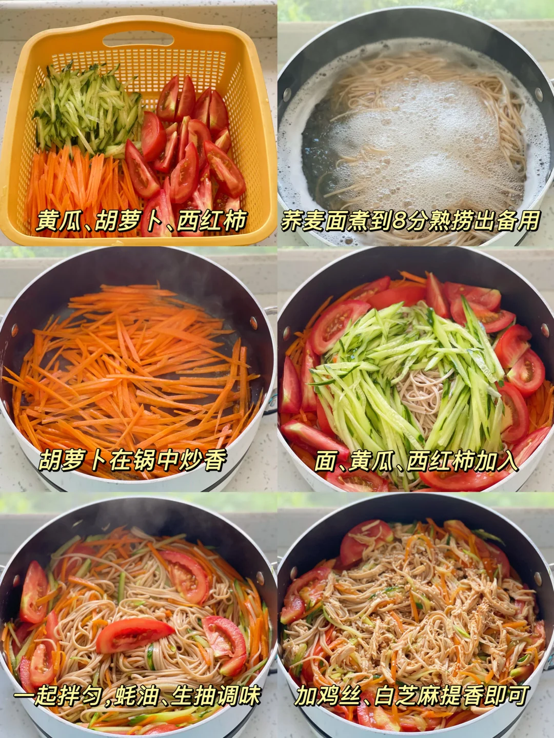 4️⃣荞麦面、黄瓜丝、番茄一起下锅中,小火一边煮一边拌匀,蚝油、生抽调味