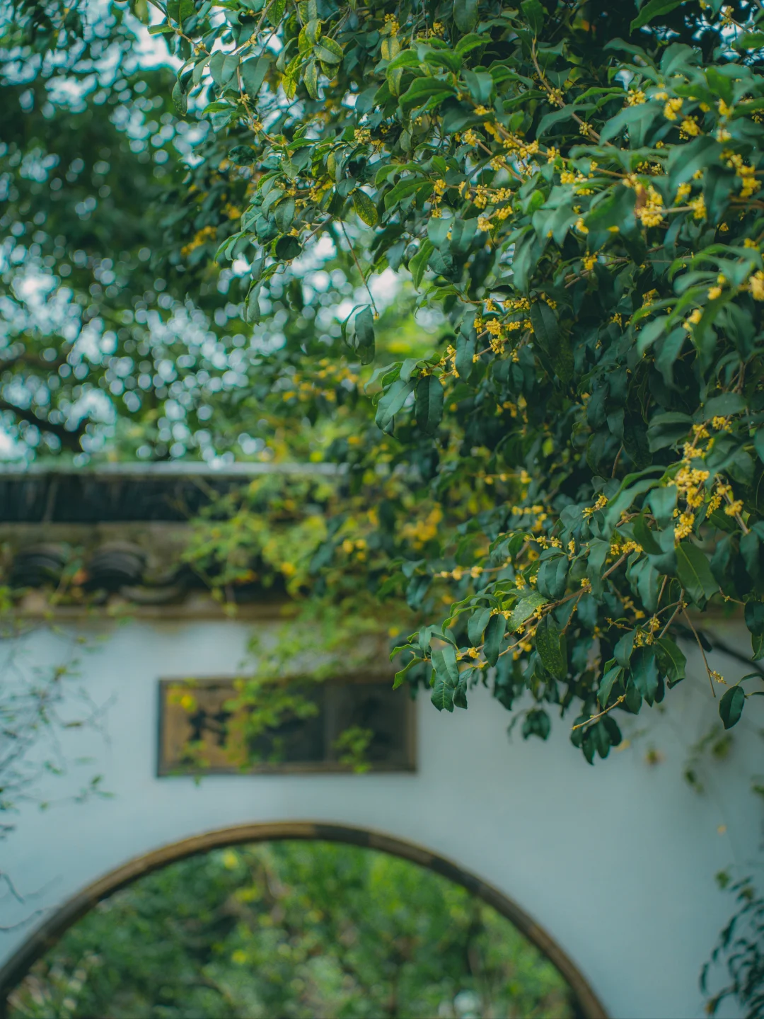 “桂子月中落,天香云外飘” 在留园又一村的月洞门前 我真正读懂了这句诗的意境 白墙黛瓦的圆拱门后 那株老桂树正簌簌洒下碎金 秋风穿门而过 把甜糯的香气酿成陈年的酒 醉得青石板都泛着温润的光 今早看桂时想到 我们追逐的从来不是花本身 而是这扇门框住的 中国人骨子里的浪漫—— 把无常的时光 凝固成圆满的符号 - ✨️10.21中午实拍!!!桂花开了! -