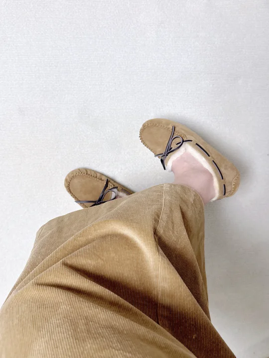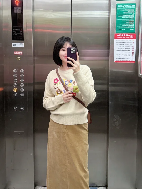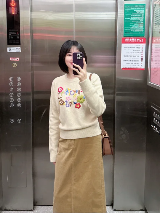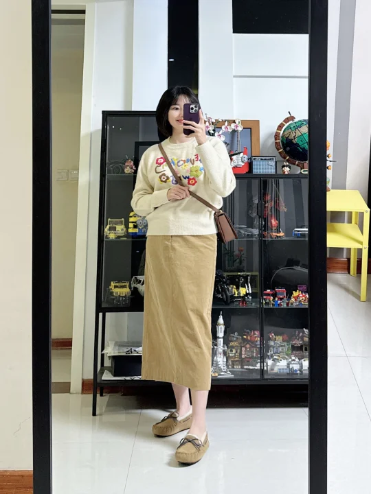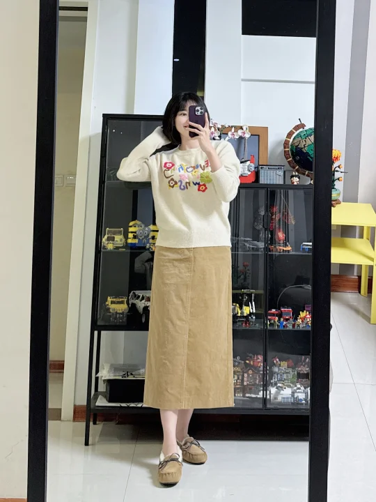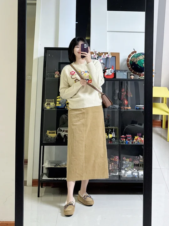 👩穿搭分享:米色毛衣搭配复古灯芯绒直筒半裙,同色豆豆鞋,减龄舒适的日常穿搭~