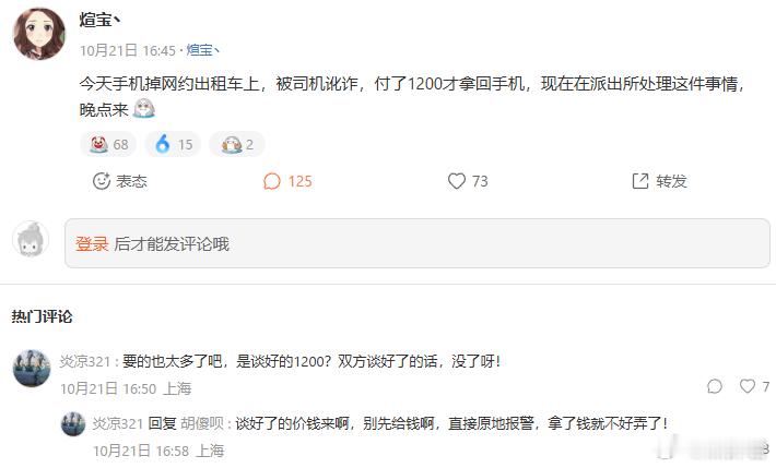 啊,煊宝手机掉出租车上,送回1200,不懂就问,这种报警会管吗