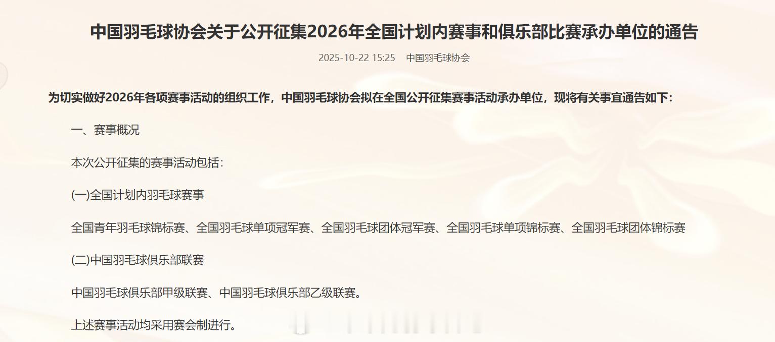 中国羽毛球协会关于公开征集2026年全国计划内赛事和俱乐部比赛承办单位的通告