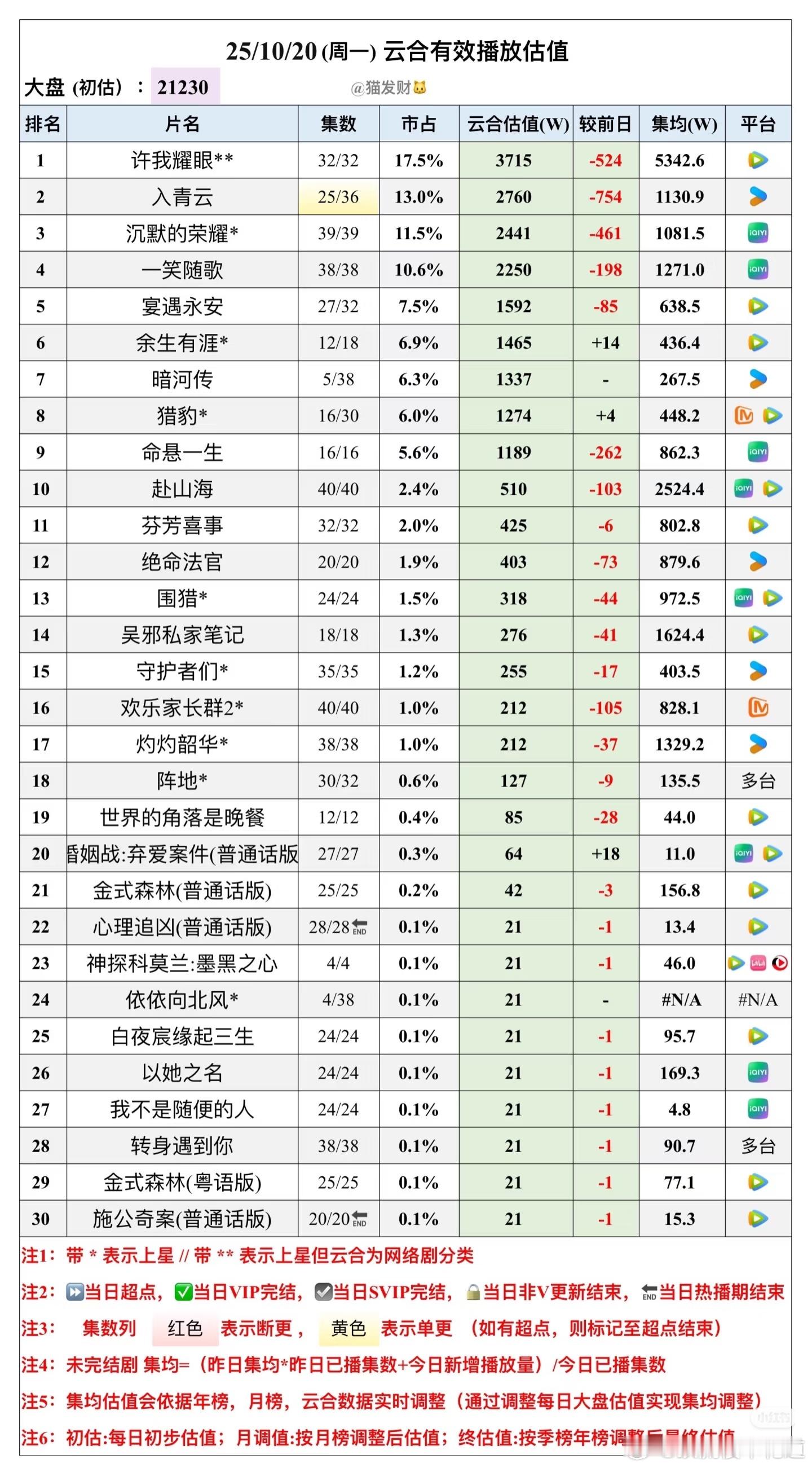 10月21日云合播放占比云合许我耀眼依然在榜首,在播剧任重道远啊。暗河传7.9