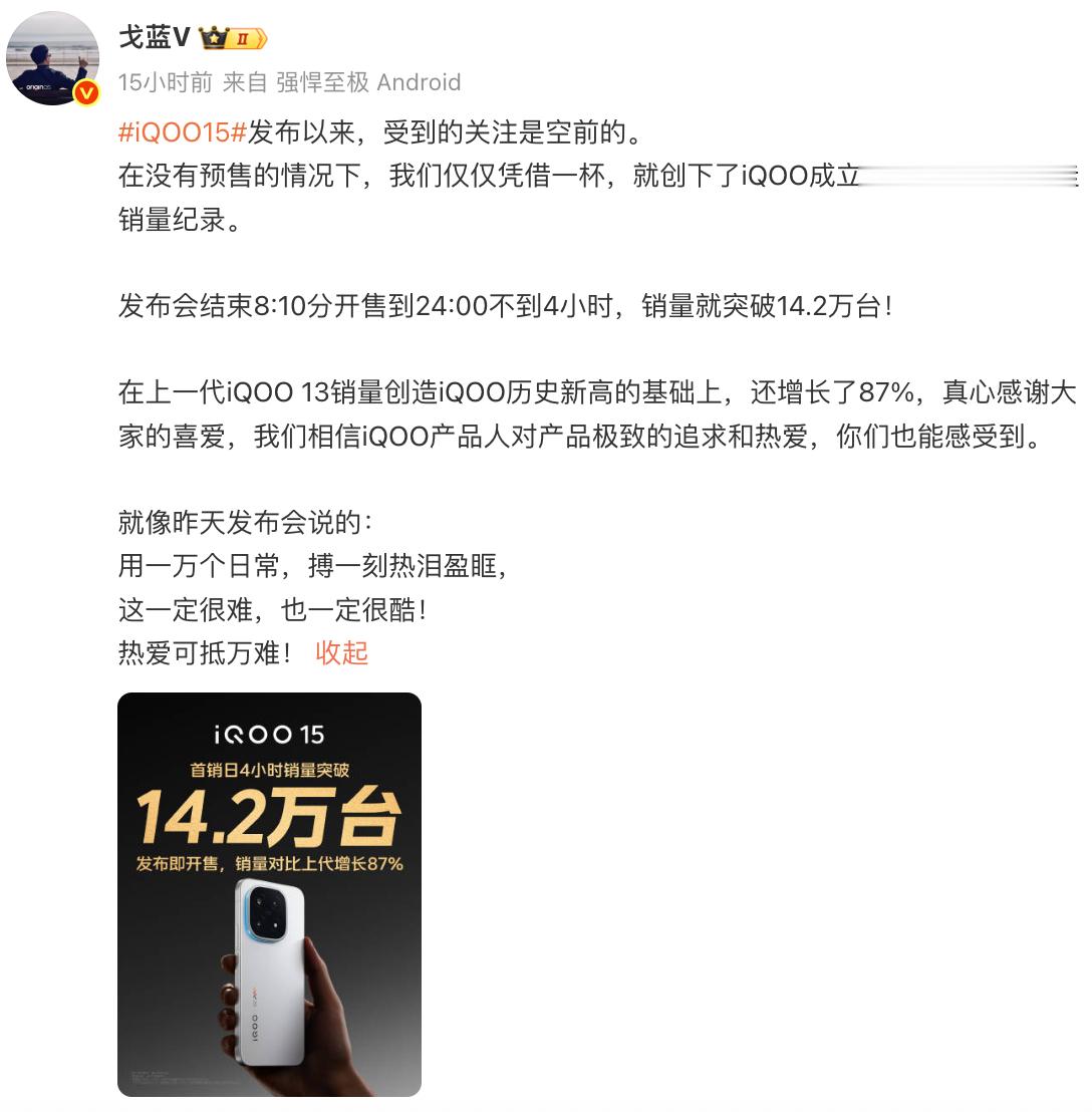 其实iQOO 15卖爆都是在意料之中的,之前看了评测和发布会的朋友其实也都知道,iQOO 15的产品力有多强,骁龙8 Elite Gen5 + Q3电竞芯片+ LPDDR5X Ultra Pro + UFS 4.1 + 真2K三星LEAD OLED屏幕 的顶配铁五角,不是三角了,属于是样样都能行,甚至影像方面也升级到了5000万像素三摄,潜望镜头回归加上旗舰影像算法,可以这么说,下半年最值得购买的、实力最强的性能旗舰,非iQOO 15莫属。