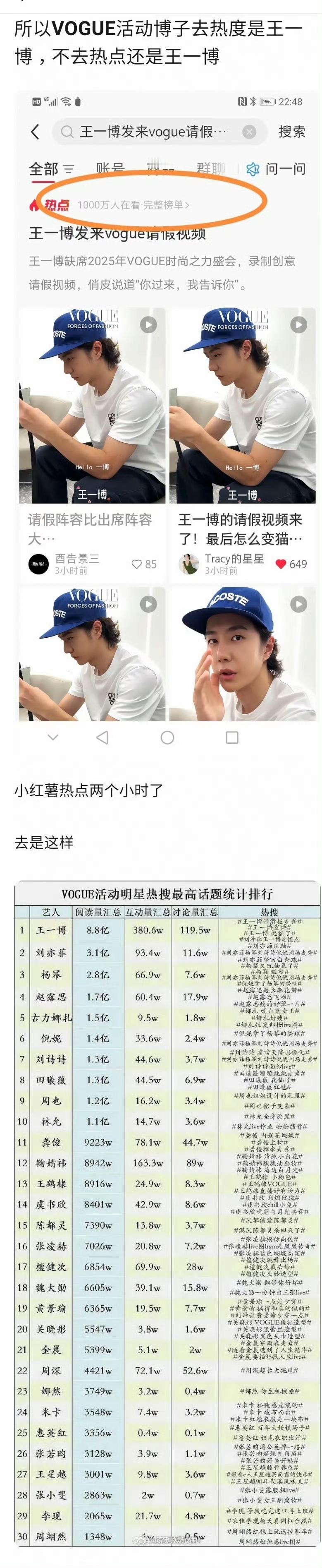 王一博[超话] Vogue盛典这场子,真是离了谁也离不了王一博的“存在感魔法”! 今年人还没到,一段请假视频直接在小红书炸成烟花,评论区全在玩“寻人启事”梗;去年更狠,人一出场,热搜榜直接给他腾了半壁江山,热度断层得像开了外挂。 合着这盛典不是看谁去了,是看王一博用哪种方式“霸屏”——在线就当活体焦点,离线也能靠回忆杀稳坐C位,这才是内娱顶流的“缺席也赢麻了”名场面吧!