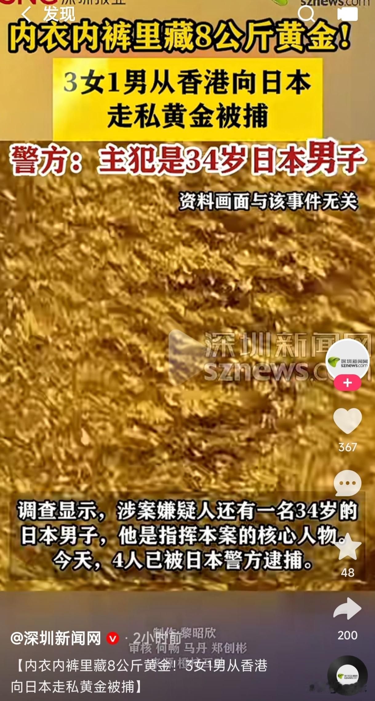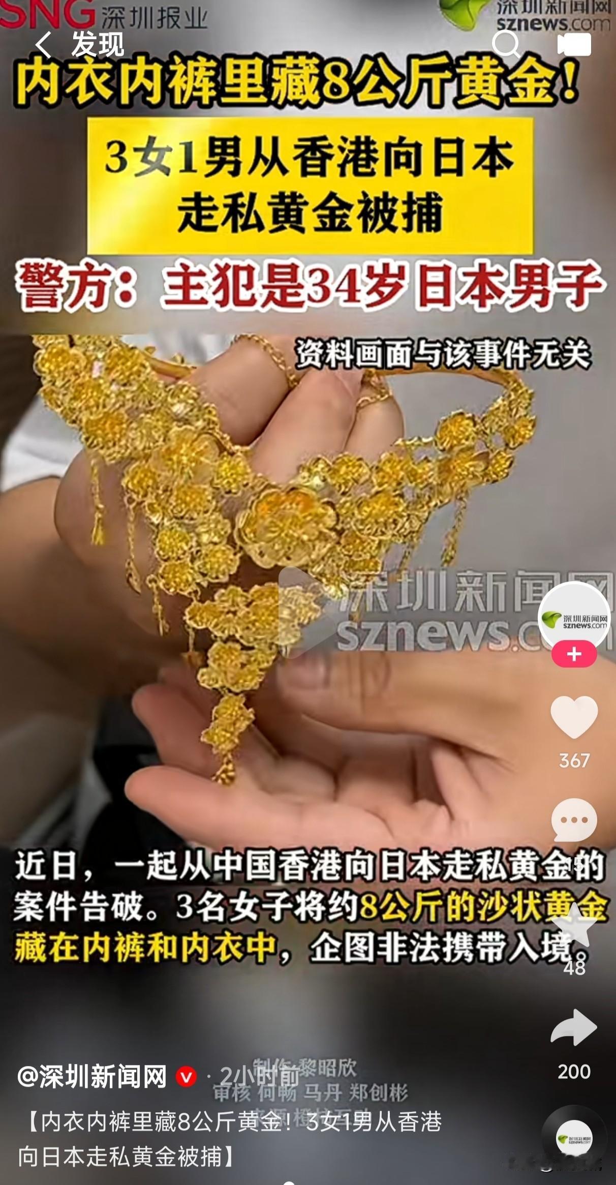 据深圳新闻网报道,3女1男走私黄金居然把黄金藏在了内衣内裤里,而且主犯还是日本男子,这8公斤的黄金可谓是一笔不小的数字。 居然从香港向日本走私黄金,把黄金藏在了内衣内裤里,这办法真的可行吗?过安检一扫不是一清二楚吗?为什么不吞进肚子里,或者藏进肛门,或者其它的地方呢?真是搞不懂这种人是聪明还是笨呢? 任何违法乱纪的事终究是逃脱不了的,这种搞走私的,不管你藏在衣服里还是藏在体内,在高科技的神速下,任何办法都是徒劳的,只能是自找其辱,规规矩矩的做一个守法的人不好吗?
