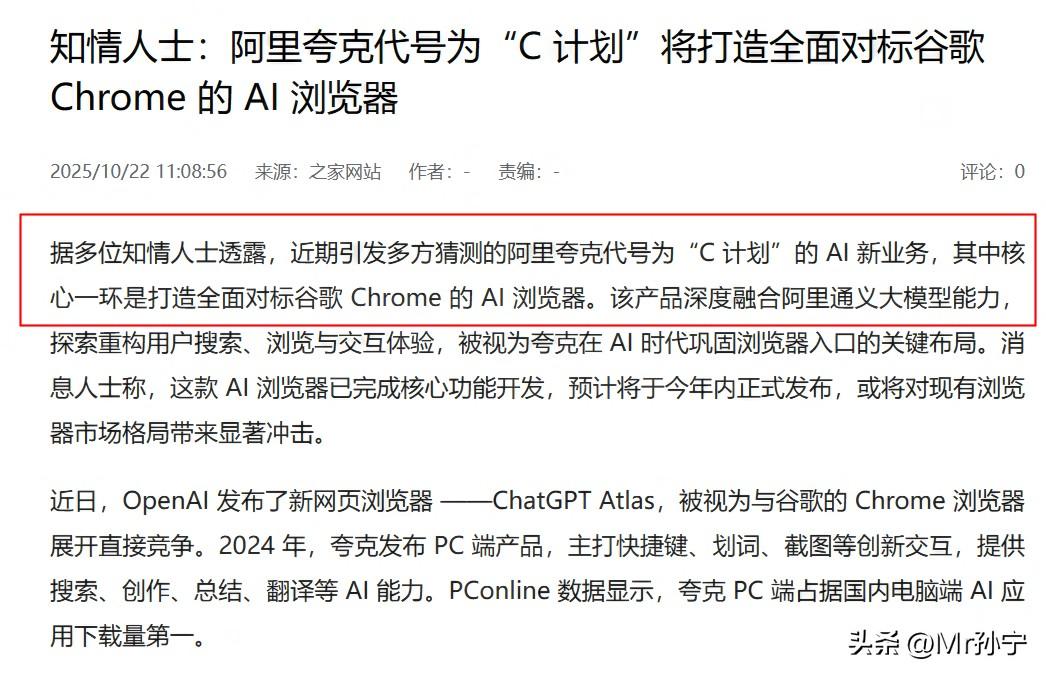 高德扫街榜之后,阿里再传秘密项目,信息很不一般! 一切都太快,高德扫街榜刚面世仅1个月,阿里再次传出正在推进秘密项目。 据媒体独家爆料,阿里夸克内部一直在推进一个名为“C计划”的AI业务,近期就有可能有成果落地。 值得一提的是,社交平台上也有很多人爆料称,夸克某团队周末连续在加班,就连会议室也贴上了封闭开发中。 由此可见,阿里在推进秘密项目这事,必然是八九不离十了,至于说C计划到底是什么?咱们也可以猜测一二。 最可靠的说法是在打造一款AI浏览器。据知情人士透露,夸克C计划很重要的一部分就是打造一款全面对标谷歌Chrome的AI浏览器,并且年内就会推出。 除此之外,还有另外几种可能,例如有人说,C的含义可能指的是Camera,也就是夸克AI眼镜,因此有人猜测这个计划是做一个AI眼镜。 还有人则认为C指的是Chat,夸克应该要做的是一个对话有光的AI产品。 具体是什么,咱们只能拭目以待等待阿里揭晓,但是可以笃定的是,这次的秘密项目肯定不一般,恐怕又是对行业的一次冲击和变革。 而且从资本市场反应来看,爆料第二天,阿里股价就上涨了4个点,可见大家同样很期待,很相信阿里能够搞出一个牛的产品。从今年阿里的动作来看,我同样深信这一点!
