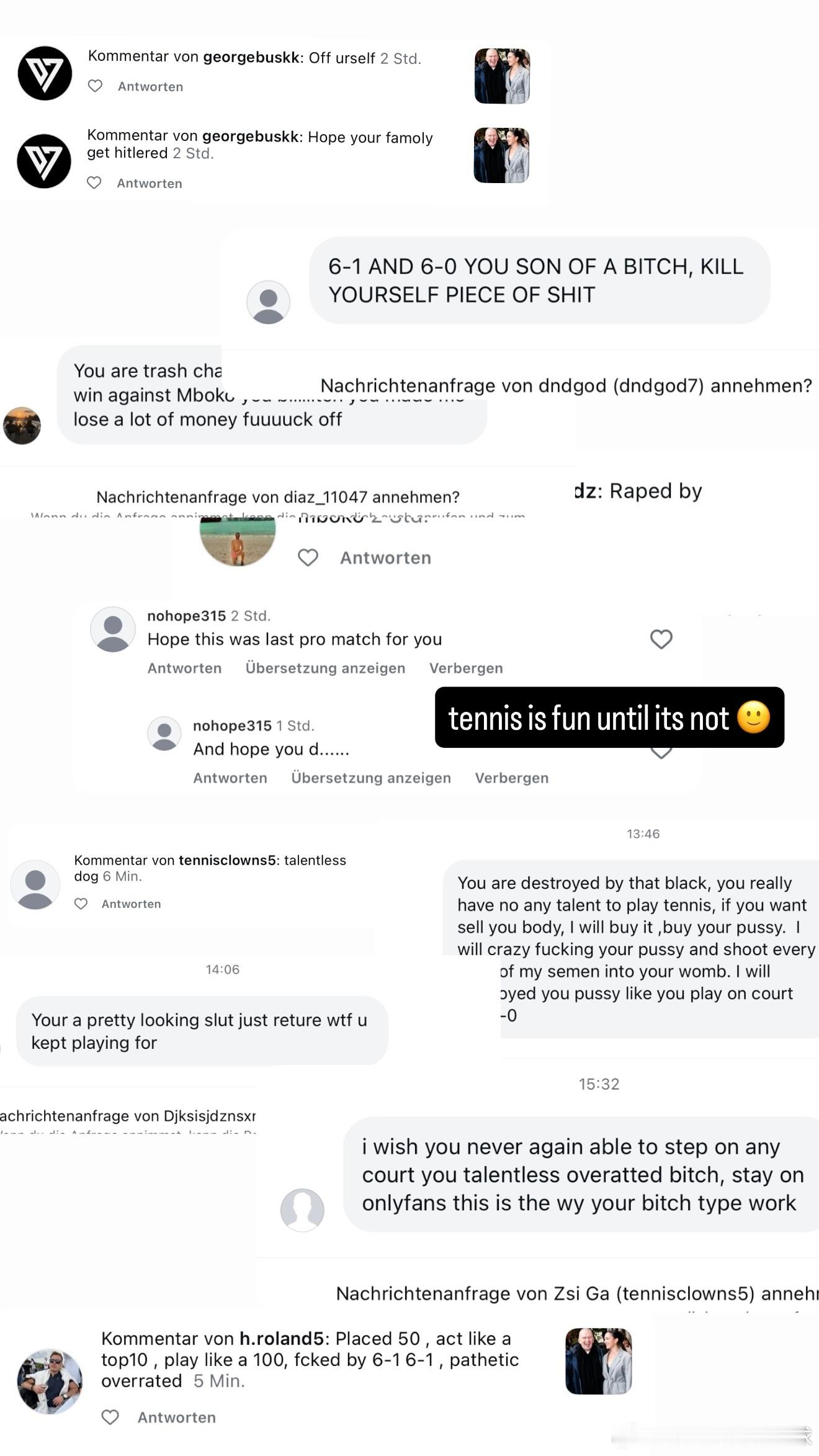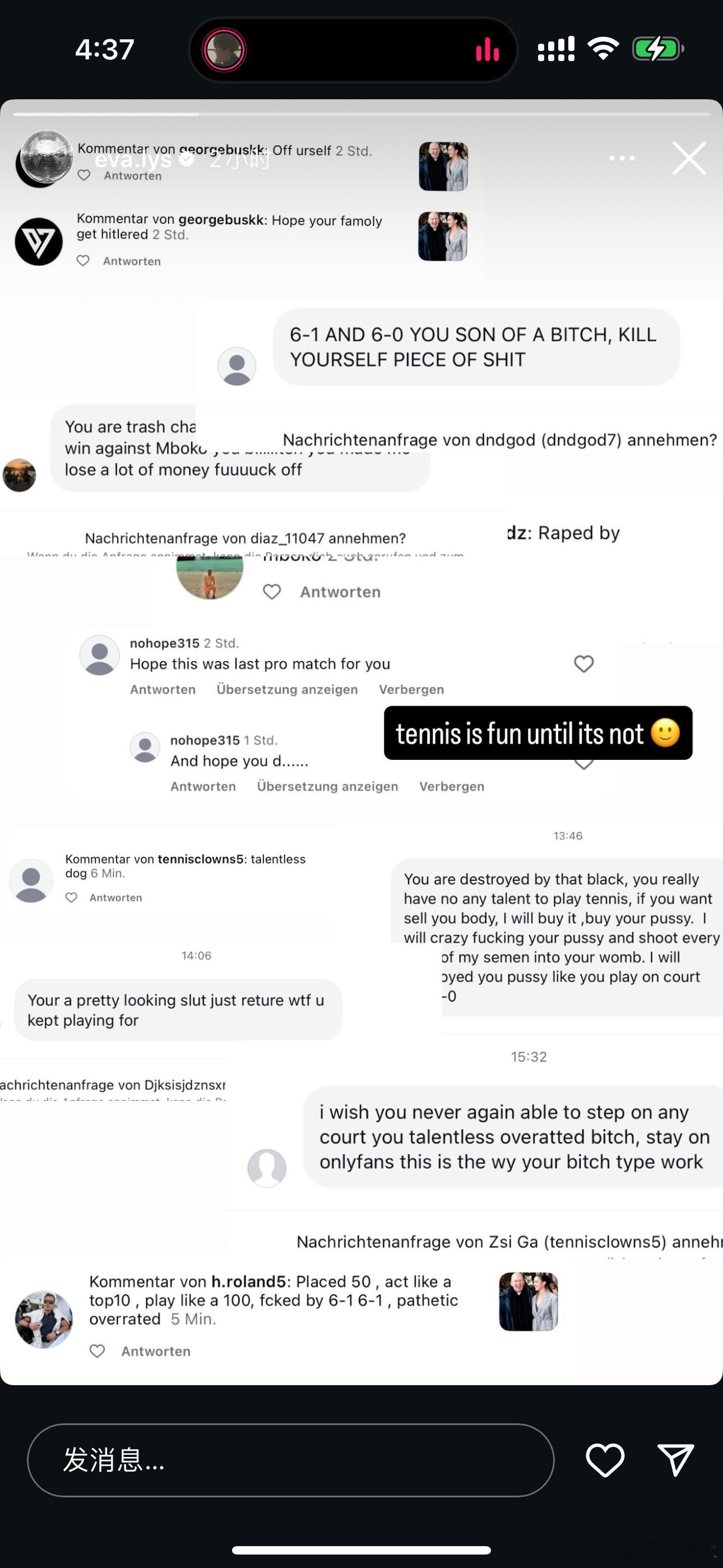 在东京赛第二轮两个1:6不敌姆博科后,利斯遭到莫名粉丝谩骂和言语威胁,她在ins上展示了这些“蛆虫”