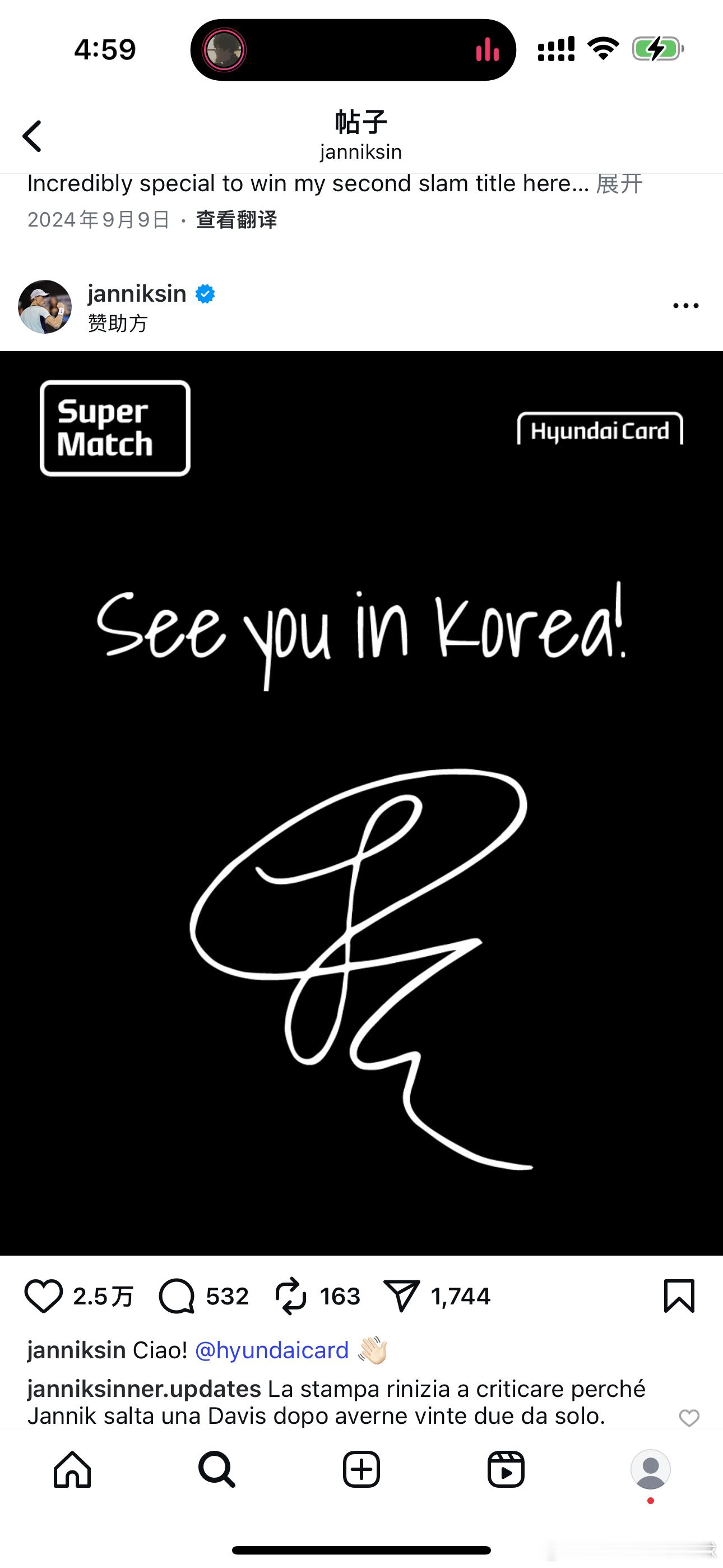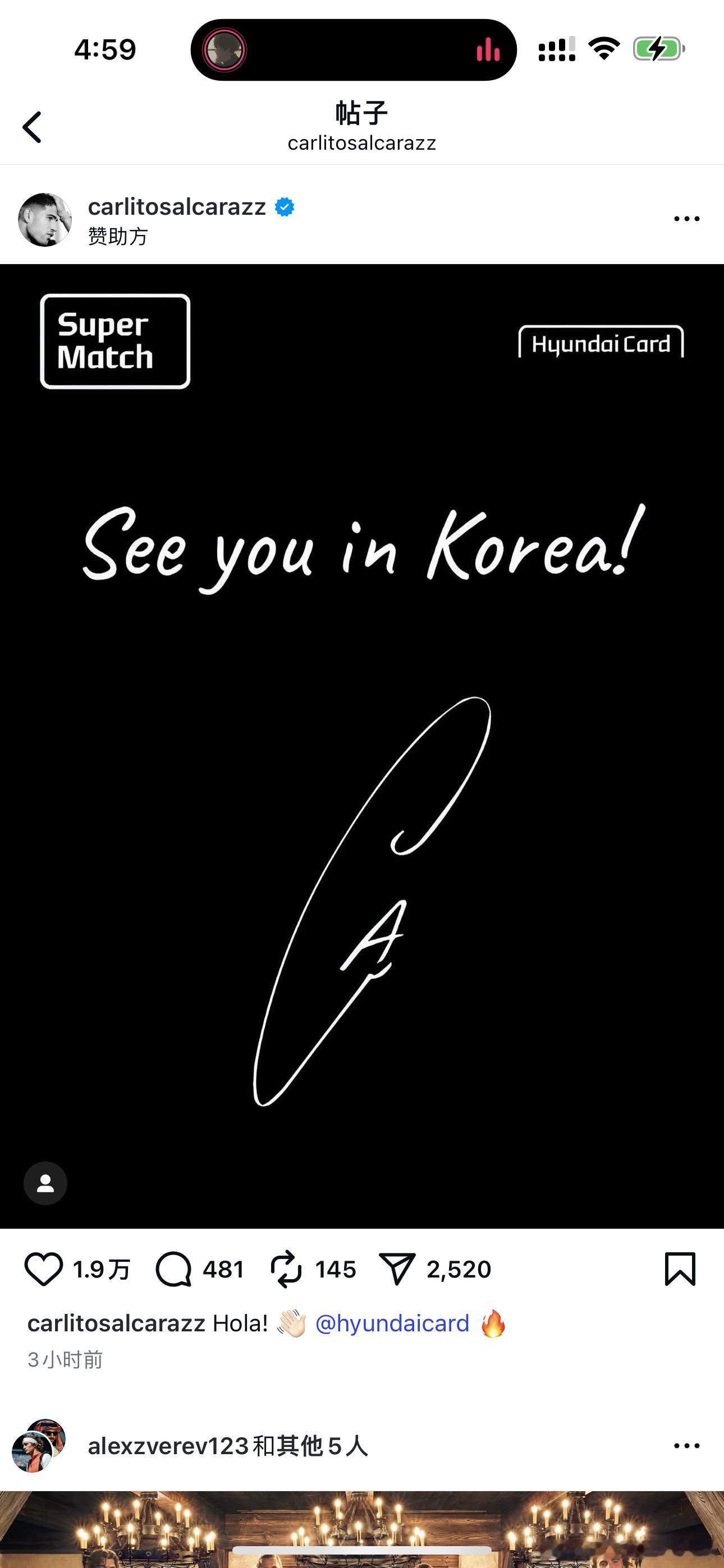 阿尔卡拉斯和辛纳同时在ins上发文:see you in korea(韩国见)