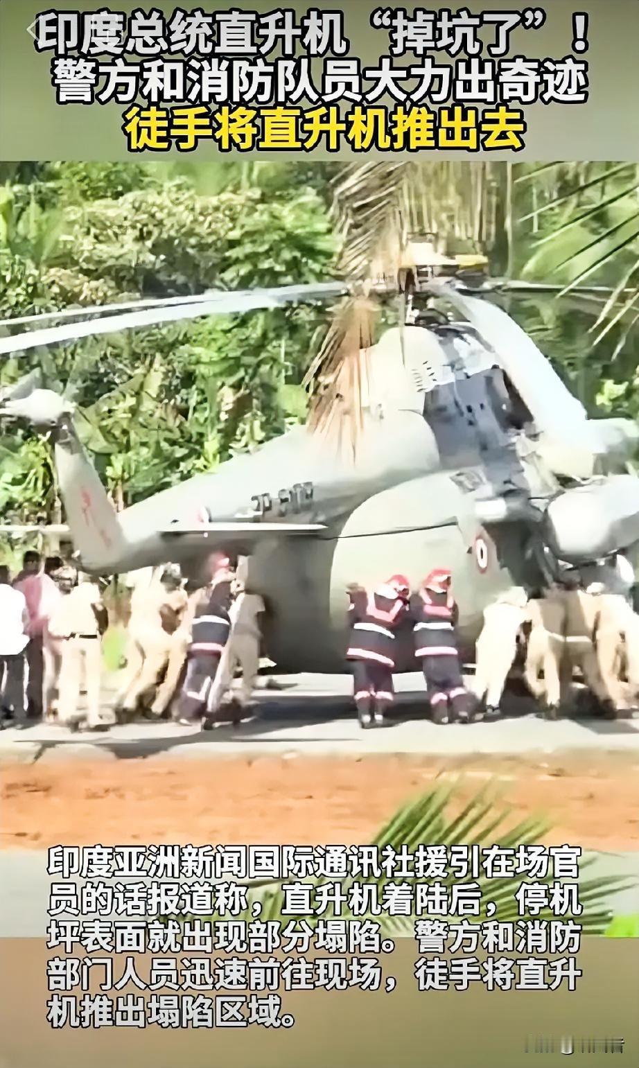 印度总统直升机降落,新修停机坪当场“跪了”!官员徒手推机超狼狈 意不意外,惊不惊喜?现场太尴尬!印度总统穆尔穆今日视察喀拉拉邦,专机刚触地,崭新的直升机停机坪竟轰然塌陷——前轮直接陷进水泥坑,总统座驾瞬间“栽跟头”。现场视频疯传网络:穿着制服的警察消防员一拥而上,徒手推直升机的画面让人瞠目。 更打脸的是,这个停机坪是当地政府为迎接总统特意赶工浇筑的“面子工程”。现场官员强行挽尊称“总统安全无虞”,但网友根本不买账:“这就是印度基建?”“下次总统该骑大象出行更安全”。 此事已引爆印度舆论场:反对党痛批“国家耻辱”,土木专家直指水泥标号不足,而承建商连夜删除官网信息…莫迪的“印度制造”战略遭致命一击! 你觉得这是“豆腐渣工程”?腐败监管?技术缺陷?还是自然灾害引起的?欢迎评论区开怼! 我要上热门