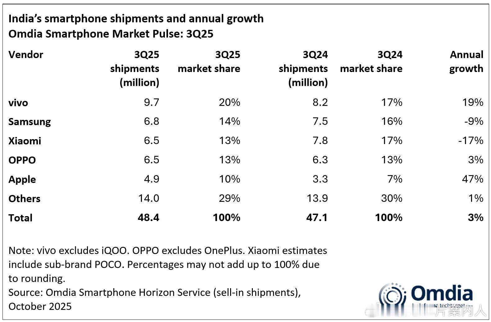 Omdia 2025Q3印度智能机市场数据,总体增长3%,达到4840万部。vivo蝉联了印度市场的季度榜首。
