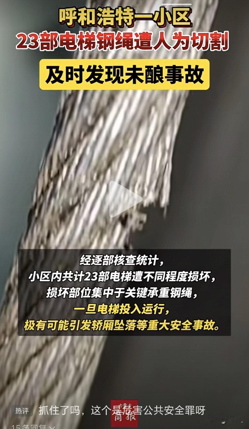 23部电梯的“夺命索”,就藏在每日的必经之路!网友:这不是破坏,这是无差别屠杀未遂! 23部电梯的“生命线”被割断:这不仅是犯罪,更是对整个社会的宣战! 近日,内蒙古呼和浩特某小区,检修人员在日常巡检时,发现电梯承重钢绳有被人为切割的痕迹。 如果受损电梯运行起来,是有可能发生轿厢坠落等重大意外事故的。 检修人员迅速摸排小区所有电梯,惊恐发现有高达23部电梯的钢绳被切割破坏。 于是,立即停机锁定受损电梯,业主委员会报警并发布紧急通知,目前电梯仍处于停运状态。 因为发现及时,并没有人员伤亡。 想一想,真是毛骨悚然,后脊发凉啊!23部电梯的承重钢绳被人为切割。如果有业主启动电梯,会有什么后果? 不敢想,不能想,不忍想! 评论区直接炸锅: “这个是危害公共安全罪呀!” “已经涉嫌故意杀人了。” “这个行为性质太恶劣了,几乎等同于谋杀罪!” “能进入电梯内部破坏,这个人可能是内部人员,外面的人进不去。” “这是个恶魔!该严惩不贷!坐牢去吧!” “故意杀人!” “谋财害命,严惩不贷!” “电梯井也能出入,就是内行人行为,应该好追查。” “报警!故意杀人罪,危害公共安全罪!” “是道德沦丧还是人性的扭曲,他到底经历了什么,能干出这种事情,幸亏没发生事故!” “严查严判!” “这不是破坏,这是无差别屠杀未遂!” 这简直就是骇人听闻、丧心病狂! 电梯的钢缆绳如果断了,后果不言而喻,电梯里的人几乎没有生还的可能! 不知道究竟是怎样的仇恨,让作案者下此毒手,我们无从得知。 但是冤有头债有主,有什么冤屈有什么矛盾,该沟通沟通,该上告上告,无论怎样都不应该拿23个单元全体业主的性命来泄愤! 如此的极端偏执与反社会倾向,不仅是对法律的践踏,更是对人性和道德底线的彻底抛弃。 钢绳断了可以更换,但社会安全感这根“弦”一旦崩断,修复起来将无比艰难。 这次万幸发现及时,但我们必须追问:我们的公共安全体系,能否始终跑在恶意的前面? 此案是一记沉重的警钟,它警示我们,维护公共安全,不仅需要技术的巡检,更需要法律的铁腕与全社会对生命的至高敬畏。 信息来源于内蒙古商报,侵联删!