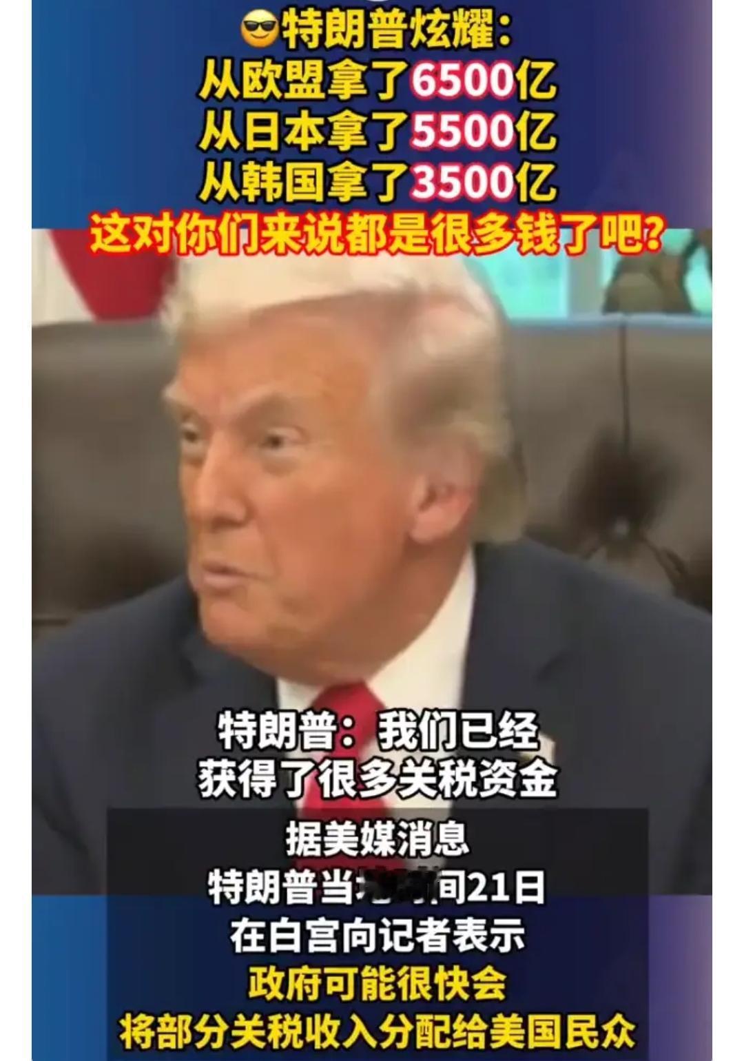 这破产开发商笑死我了。他果真是佯攻中国主割盟友,这不,税宗开会的时候宣扬自己从欧洲搞到多少钱,从日本搞到多少钱从韩国搞到多少钱,就是不敢说从中国搞到多少钱[我想静静][我想静静]因为他在中国这里得到的只有耳光。[笑哭][笑哭][笑哭] 还有他说会把这些钱分配给美国民众[捂脸][捂脸]这是美国老百姓被他抢的,不过是现在还给老百姓而已。没有他的那些乱七八糟的东西,美国老百姓根本不用花更多钱去买自己想要的商品。 这虚空造牌的毛病看来是没治了。 点右上角关注我,我们一起去看这个魔幻的世界