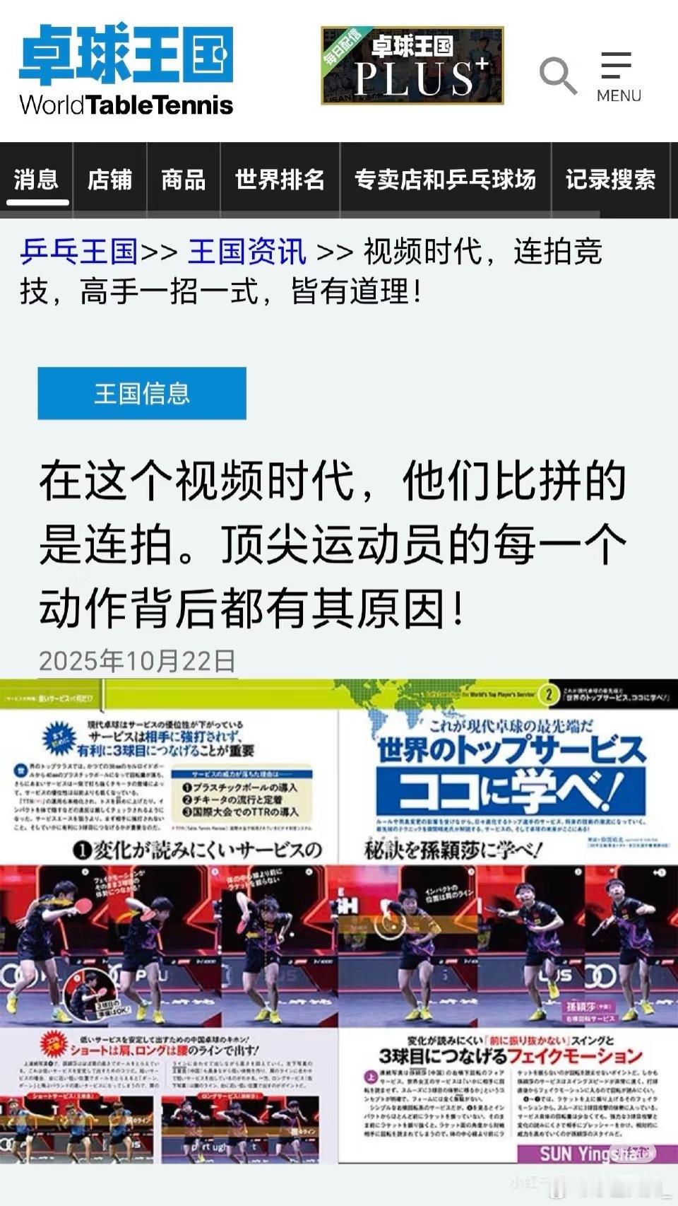日媒称赞孙颖莎发球顶尖卓球王国:可以看到球员每一个动作背后的清晰逻辑,比如封面人物孙颖莎的假动作,以及短发和长发击球高度的差异。觉得“肩线发球”这个建议对低短发很有帮助。