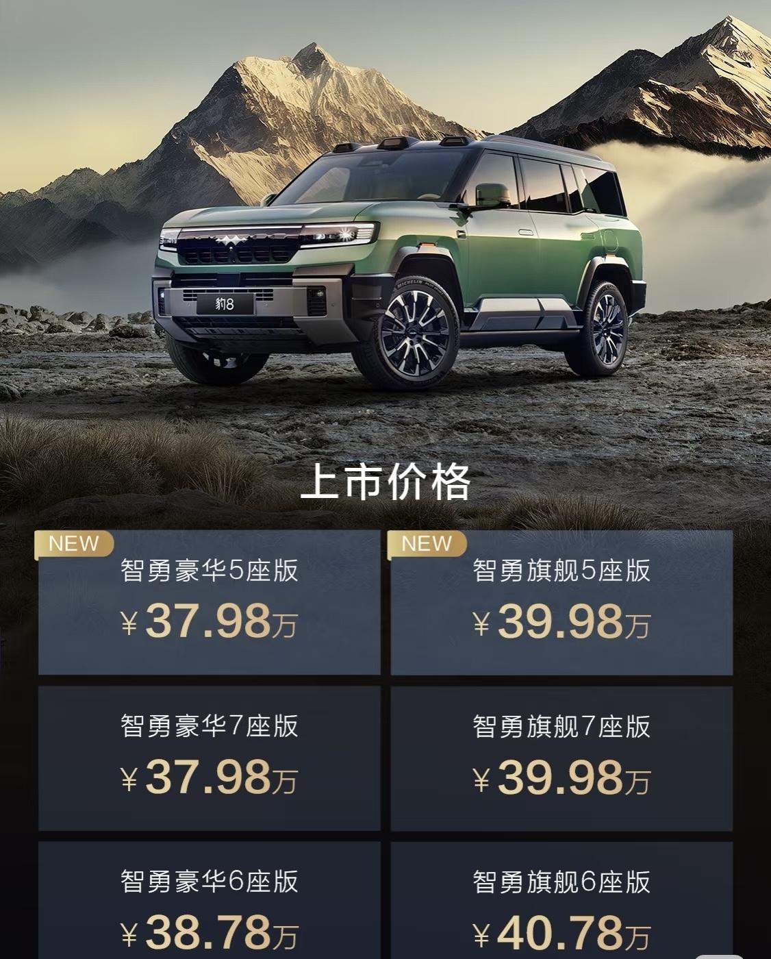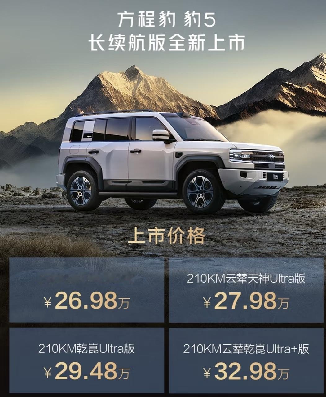 “双豹”出击!方程豹销量破20万,华为乾崑智驾让越野进入“傻瓜模式” 10月20日,方程豹交出了一份炸裂的成绩单:品牌累计销量突破20万辆大关!与此同时,豹5长续航版和豹8大五座版两款新车焕新上市,以一场“硬核科技”的狂欢,宣告电驱越野彻底告别小众时代。 01销量为王:20万里程碑,豹5封神“越野新王” 数据是最有力的证明。豹5累计销量已逼近10万台,稳坐硬派越野销量冠军宝座。更令人惊叹的是,方程豹品牌从10万到20万的跨越,仅用时5个月。这一速度,将曾经的“方盒子”小众玩具,彻底推向了主流消费市场。 02技术核弹:DMO+与华为乾崑ADS 4.0双王炸 如果说销量是结果,那么技术就是方程豹引爆市场的核弹。 全新升级的DMO+平台,带来了“全速域路面感知控制技术”。简单说,就是车辆在任何速度、任何路况下(沙地、岩石、泥地),轮端抓地力和动力输出都变得更“聪明”更稳定,堪称“越野模式”的史诗级强化,让新手也能轻松玩转高难度地形。 更大的亮点在于智驾。新车全面升级华为乾崑智驾ADS 4.0,实现了从“类人”到“超人”的跨越。其全维防碰撞系统CAS 4.0能覆盖全路况,安全感拉满;车位到车位2.0功能则打通了行车到泊车的全链路,真正实现“开得猛,停得稳”。这套系统让长途穿越不再疲惫,城市通勤也更加轻松。 03双车详解:豹5全能进阶 vs 豹8奢享旗舰 • 豹5长续航版(26.98-32.98万元):如其名,核心升级在续航。CLTC纯电续航提升至210公里,综合续航高达1310公里,彻底告别里程焦虑。同时,云辇-P百万级悬架下放、新增副驾腿托、智能防晕车模式等配置,让其“越野王”的称号更加实至名归。 • 豹8大五座版(37.98-40.78万元):定位“稀缺旗舰”,主打奢享空间。后排腿部空间和后备箱再度扩容,并配备双开门高压冰箱与多向大腿托。更重要的是,它成功斩获C-NCAP五星安全认证,成为国内首款获此殊荣的混动非承载车型,打造“双五星”安全标杆。 04安全守护:140km/h爆胎也能稳停 在用户最关心的安全层面,方程豹毫不妥协。双车均标配高速爆胎辅助稳停系统,即使在140km/h的极限时速下发生爆胎,系统也能强力介入,稳住车身姿态,为生命保驾护航。 05结语: 从豹5的“封王”到豹8的“立旗”,再到品牌冲击20万销量,方程豹用硬核的技术平权,实现了“人人可野”的承诺。这不仅是两款新车的上市,更是一场关于越野出行方式的彻底革新。电驱越野的未来,已经到来。
