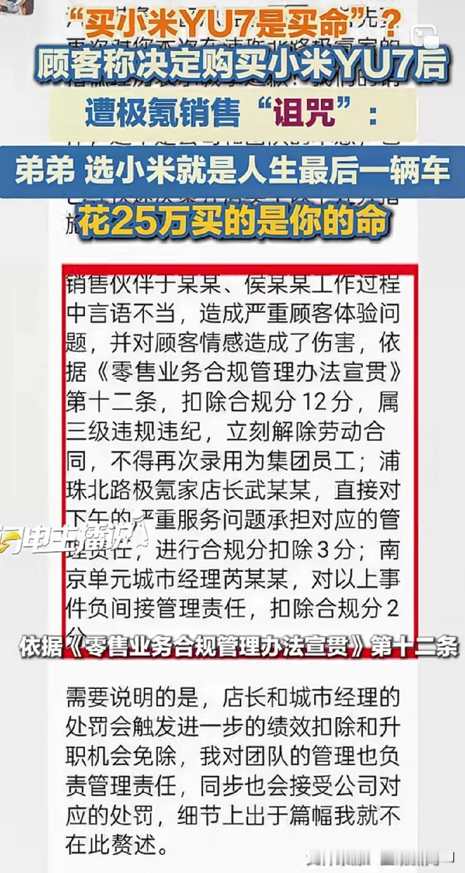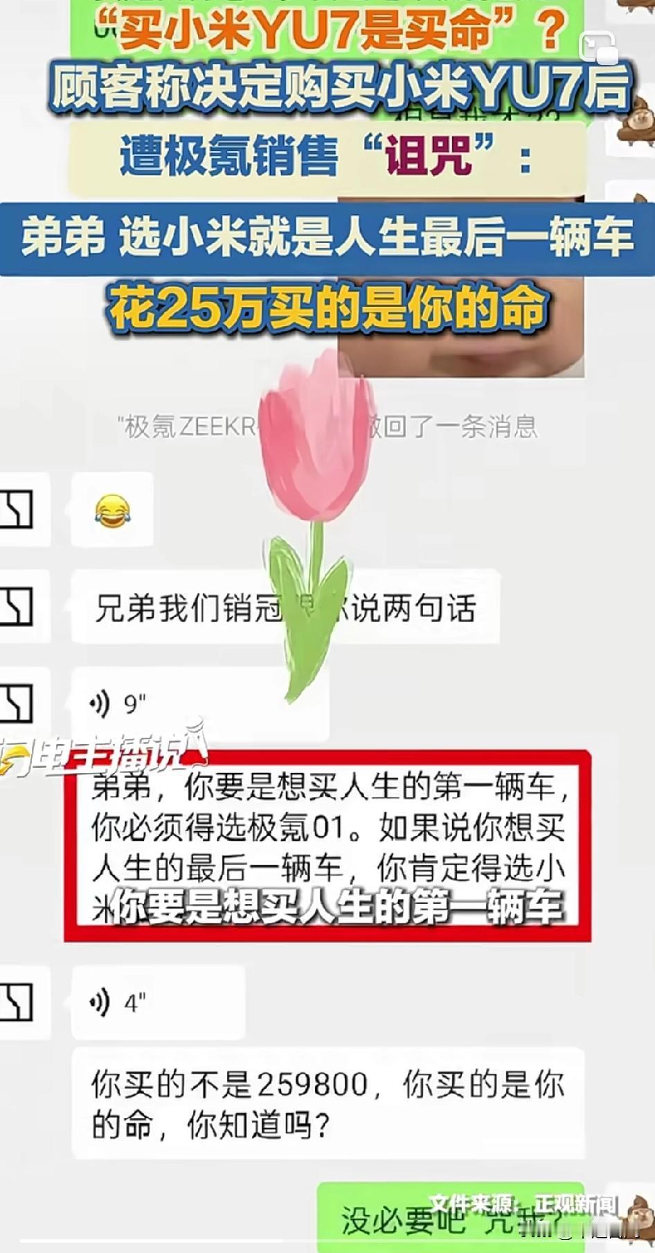 “买小米YU7是买命”?有顾客表示,在决定购买小米YU7后,遭到极氪销售“诅咒”:“弟弟,选小米就是人生最后一辆车,花25万买的是你的命。” 极氪汽车回应称,涉事的两位销售已被开除,此行为属于三级违规违纪,公司已立刻与其解除劳动合同。 聪明人都明白,越被黑的产品往往越是好产品。友商产品竞争不过,就耍阴招。手机我就选苹果,电车就选特斯拉和小米!