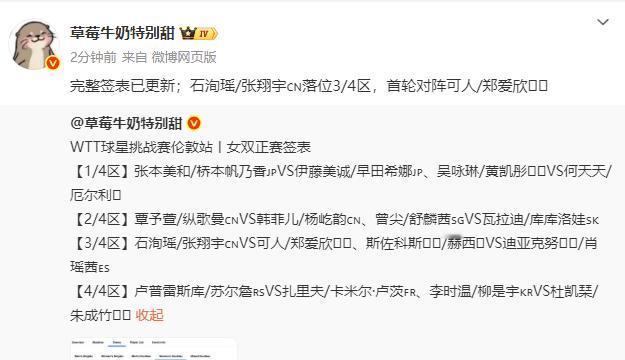 伊藤美诚和早田希娜的女双打进正赛了。 她俩的组合是“早马”组合,好不容易从资格赛打进正赛,刚刚看到WTT球星挑战赛伦敦站女双签表更新,伊藤早田正赛首轮对阵张本美和/桥本桥本帆乃香,在赛前的时候很多人就说有可能日乒女双首轮也内战,没想到还真的是呢,看到有网友说:“第一轮的日乒女双可以凑一波热闹,我压早马组合。” 今晚女双资格赛最终轮的比赛,伊藤美诚/早田希娜3-0扎里夫/卡米尔·卢茨,比分:11-3,11-5,11-7。看到早田和伊藤今晚还穿的不是一个颜色的比赛服,不过俩人是真的打开心了,一人一拍打出好球时,俩人会击掌笑一笑。这个周期,从美国大满贯开始,她俩是重新开始打女双,这一站的球星挑战赛俩人又从资格赛打进正赛了,张本美和和桥本也是配合没多久,感觉两对组合的实力也不分上下,伊藤美诚打桥本有优势。 女双正赛首轮比赛,国乒两对女双也是首轮就对上了,日乒这个女双也会有很多人看,后面看到有球迷说:“伊藤是桥本克星,早田是张本美和的克星,这波我压早马组合。”看来大家还是很看好伊藤和早田希娜这对女双了。