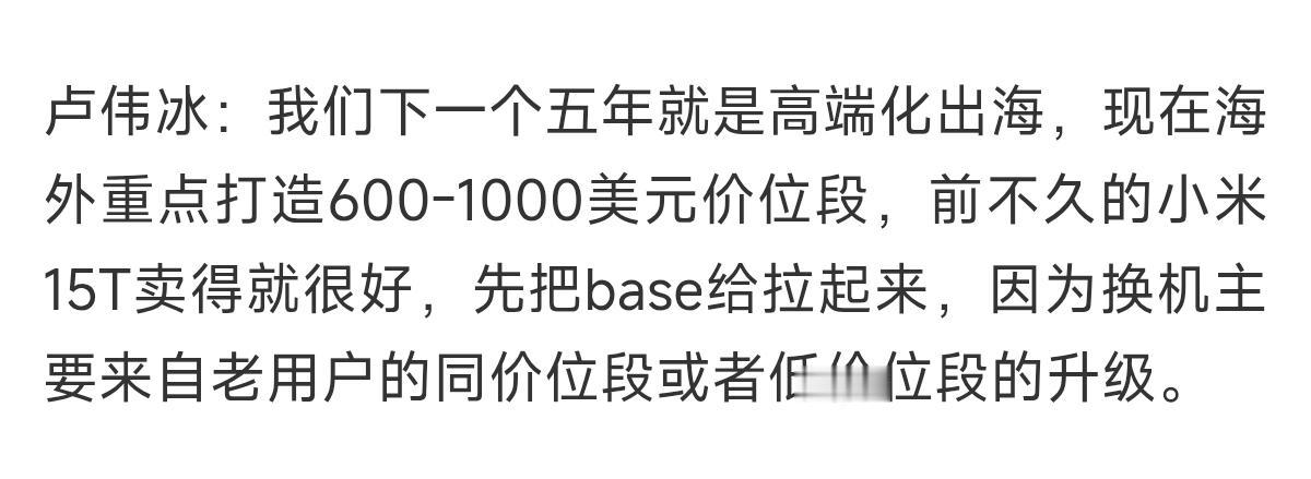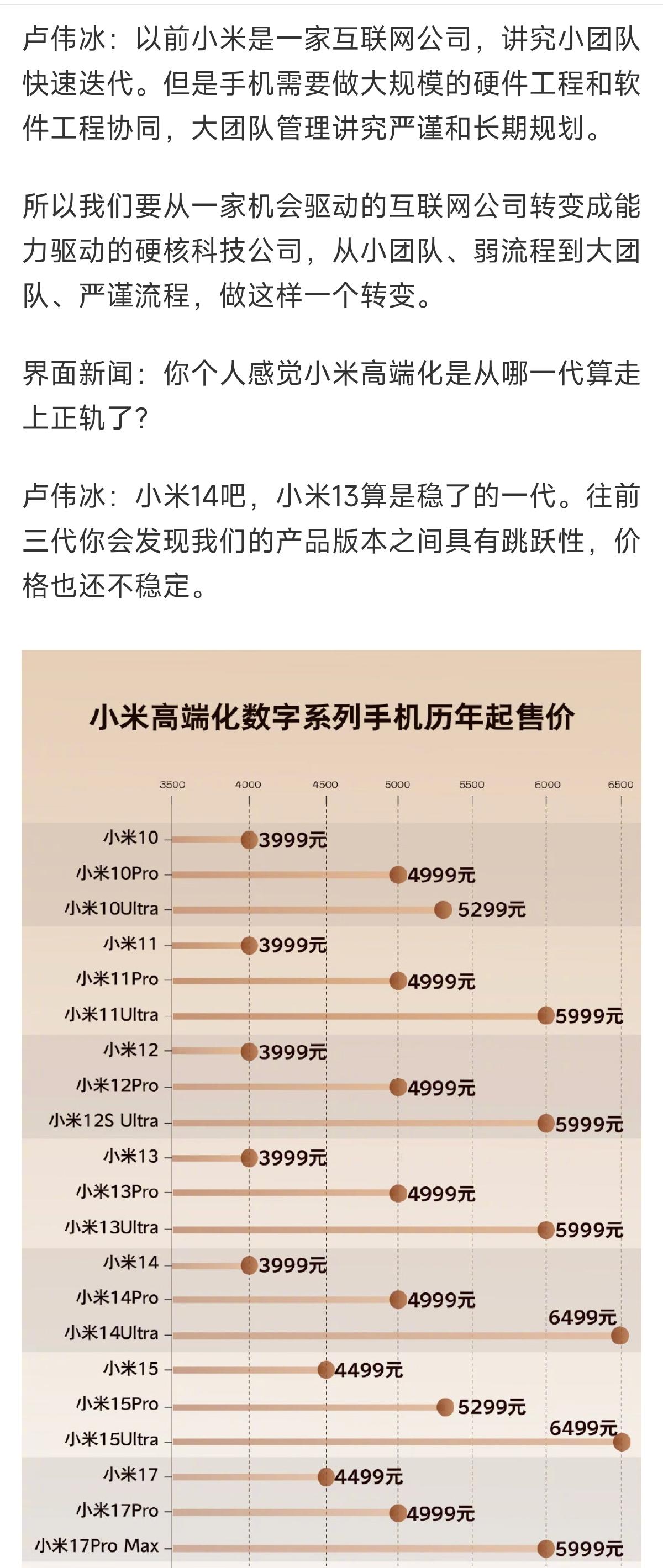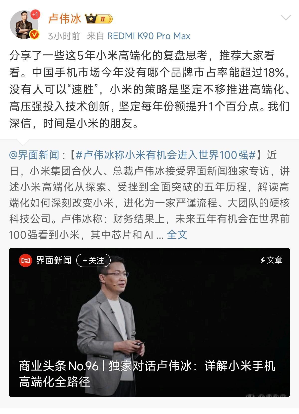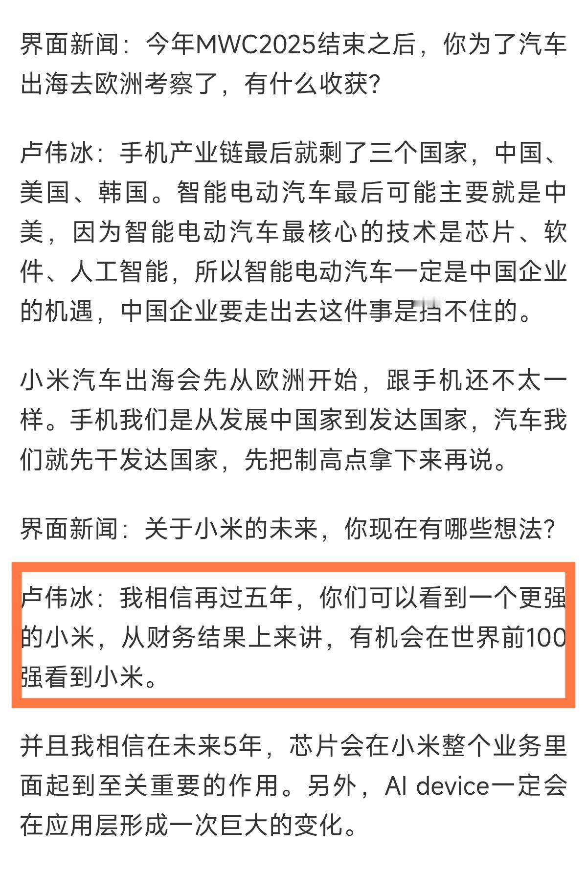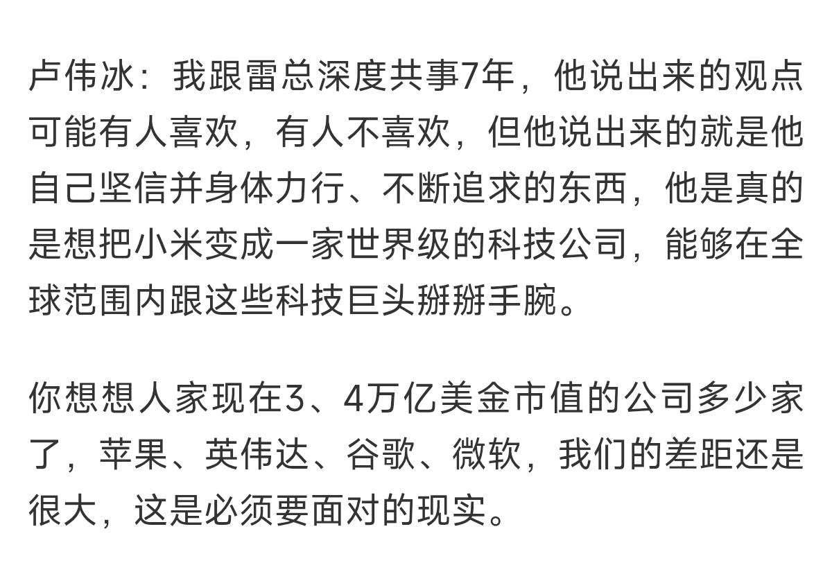 卢伟冰称小米有机会进入世界100强 狂吗?不狂。 横跨手机汽车家电三大万亿市场,自研芯片、高端出海、争取五年进入世界TOP100强…… 从量变到质变,从移动互联网公司到硬核科技公司,时间是小米最好的朋友,更是最好的证明,15年间小米用事实证明了过往的各种Flag。 干不翻我的,终究使我强大。 未来,包括汽车在内小米全部业务都将出海,并且将国内5年高端破局的方法论与新零售服务模式带到全球,加速冲击世界TOP100强目标。 总之看完这个访谈之后,我觉得这些天加仓小米的操作是正确的。 人+车+家全场景+自研芯片+澎湃OS+无处不在的AI服务,这套软硬融合的体系,未来无疑会成为小米最大的护城河!